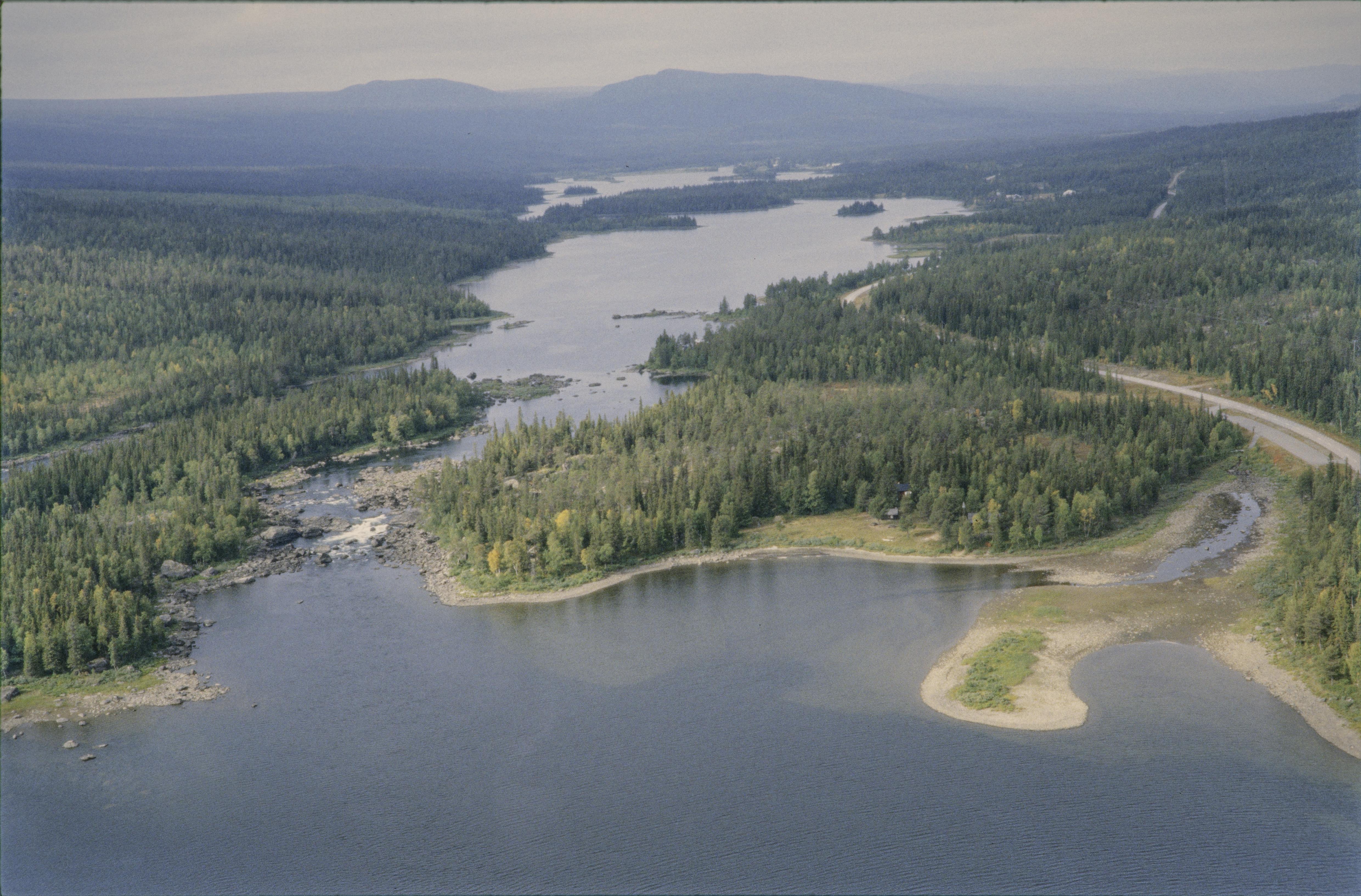 Beskrivning: Jillesnåleforsen i Vindelälven (Vidduoljiennuo). I skogen vid bildens mitt skymtar Jillesnåle kapell (Gillesnuole kapell). I området boplats och kyrklämning RAÄnr Sorsele 565:1-2, m.fl. Bilden är tagen mot (väderstreck): V
