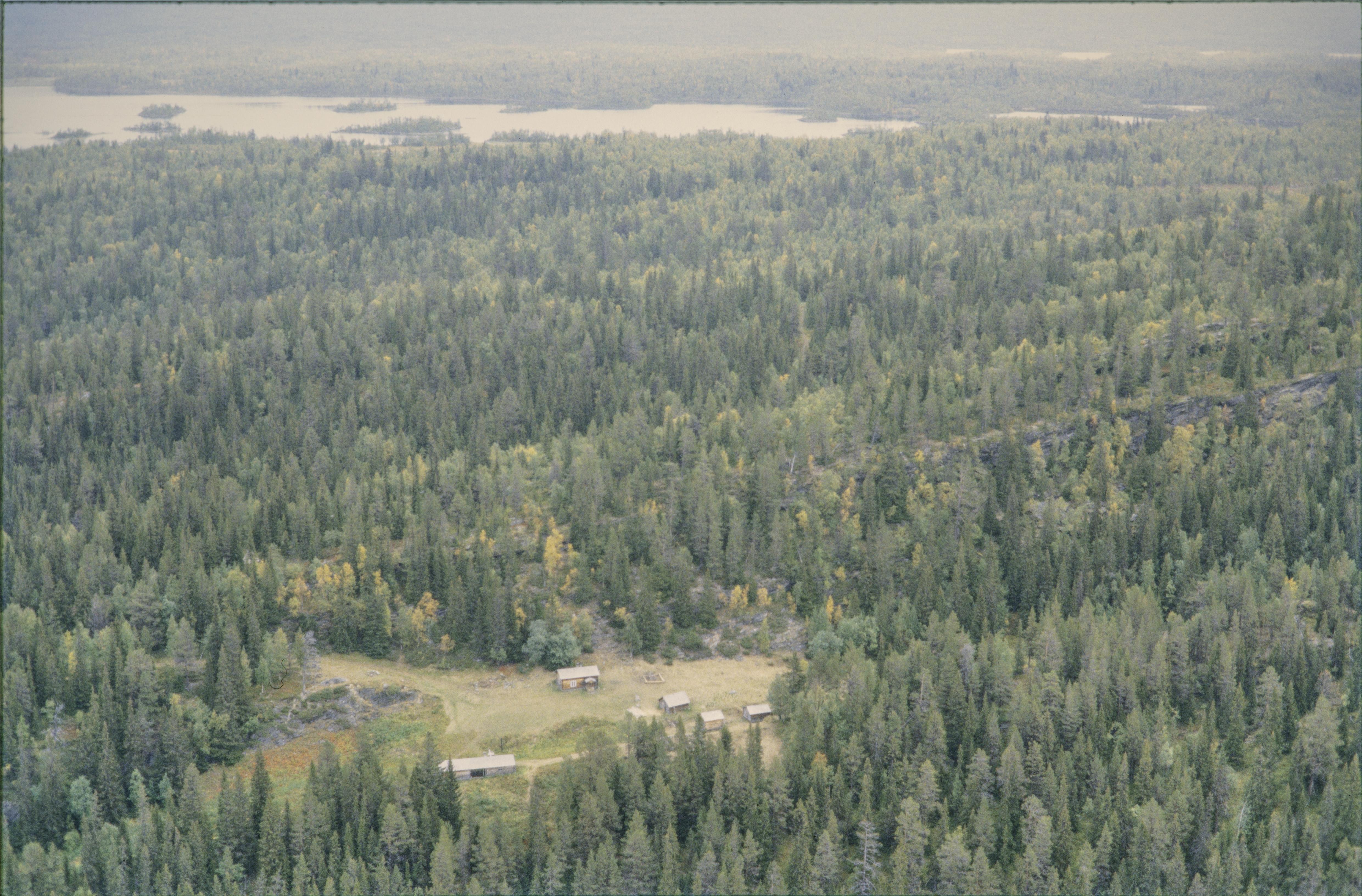 Beskrivning: Nybyggargården Örnbo sydöst om sjön Gautsträsket (Gávtjávrrie). Till vänster i bildens övre del fångstgrop RAÄnr Sorsele 675:1 vid sjön Bissásjávrrie. Området ingår i Vindelfjällens naturreservat. Bilden är tagen mot (väderstreck): NO