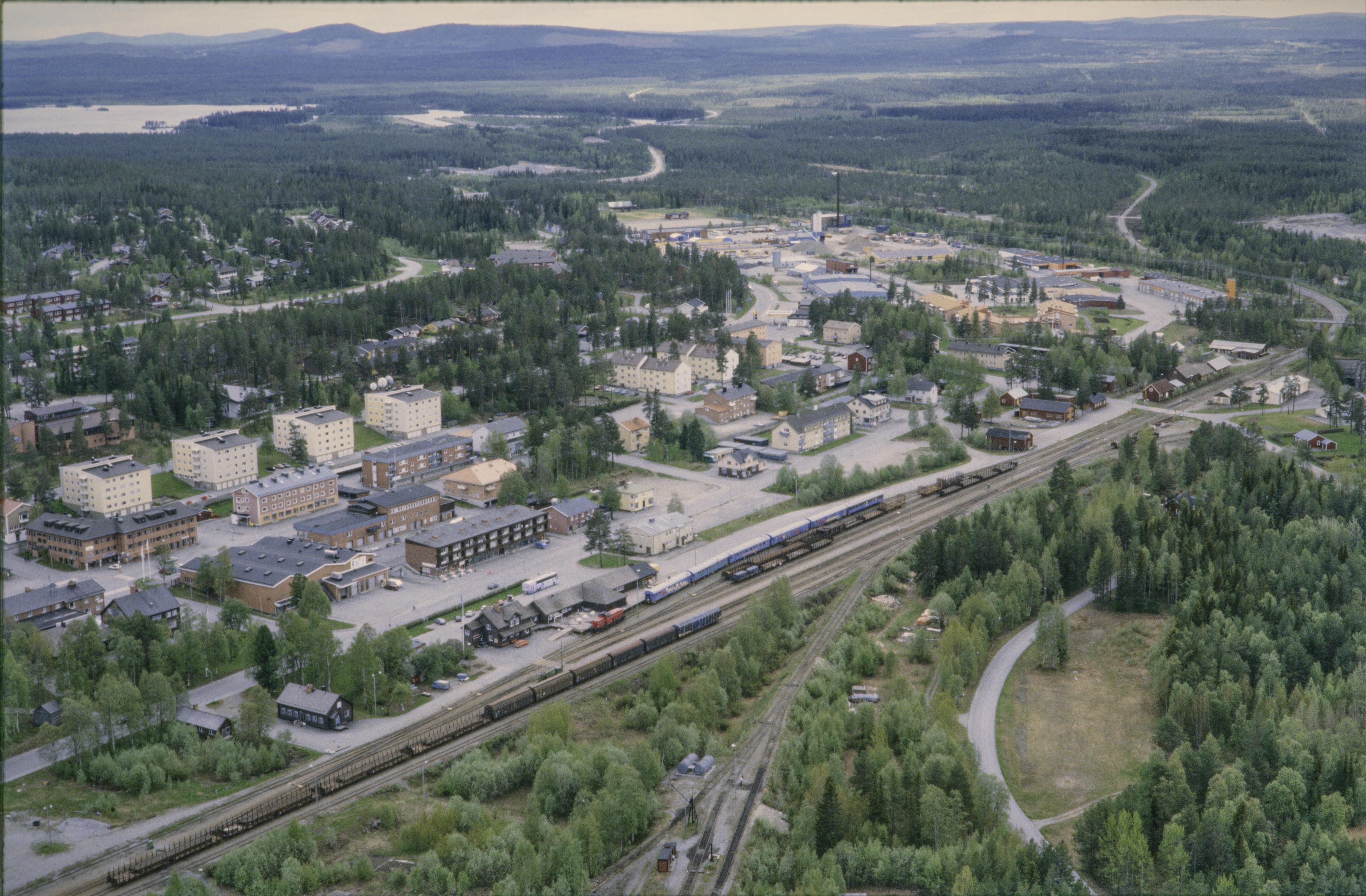 Beskrivning: Tätorten Storuman (Lusspie). Vid bildens mitt Storumans järnvägsstation. I bildens nedre kant boplats RAÄnr Stensele 88:1. Bilden är tagen mot (väderstreck): S