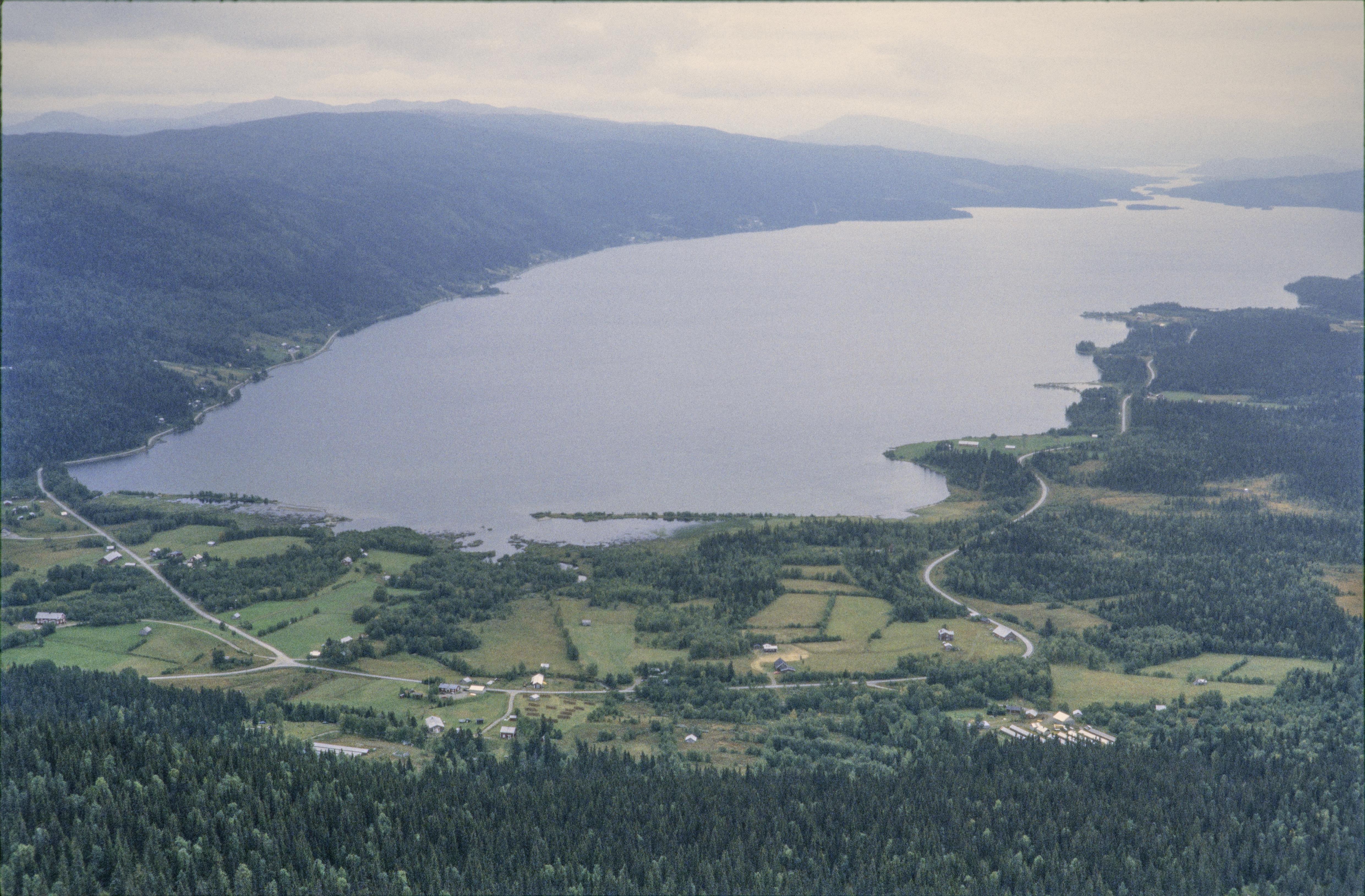 Beskrivning: Stor-Björkvattnet (Bearhkoejaevrie) i Björkvattensdalen från norra stranden mot sydost. Under bildens mitt Tärnamo by. I byn husgrund RAÄnr Tärna 985:1 och fyndplats Tärna 297:1. Byn Sörsandnäset och Gejmåns utlopp uppe till höger. Bilden är tagen mot (väderstreck): OSO