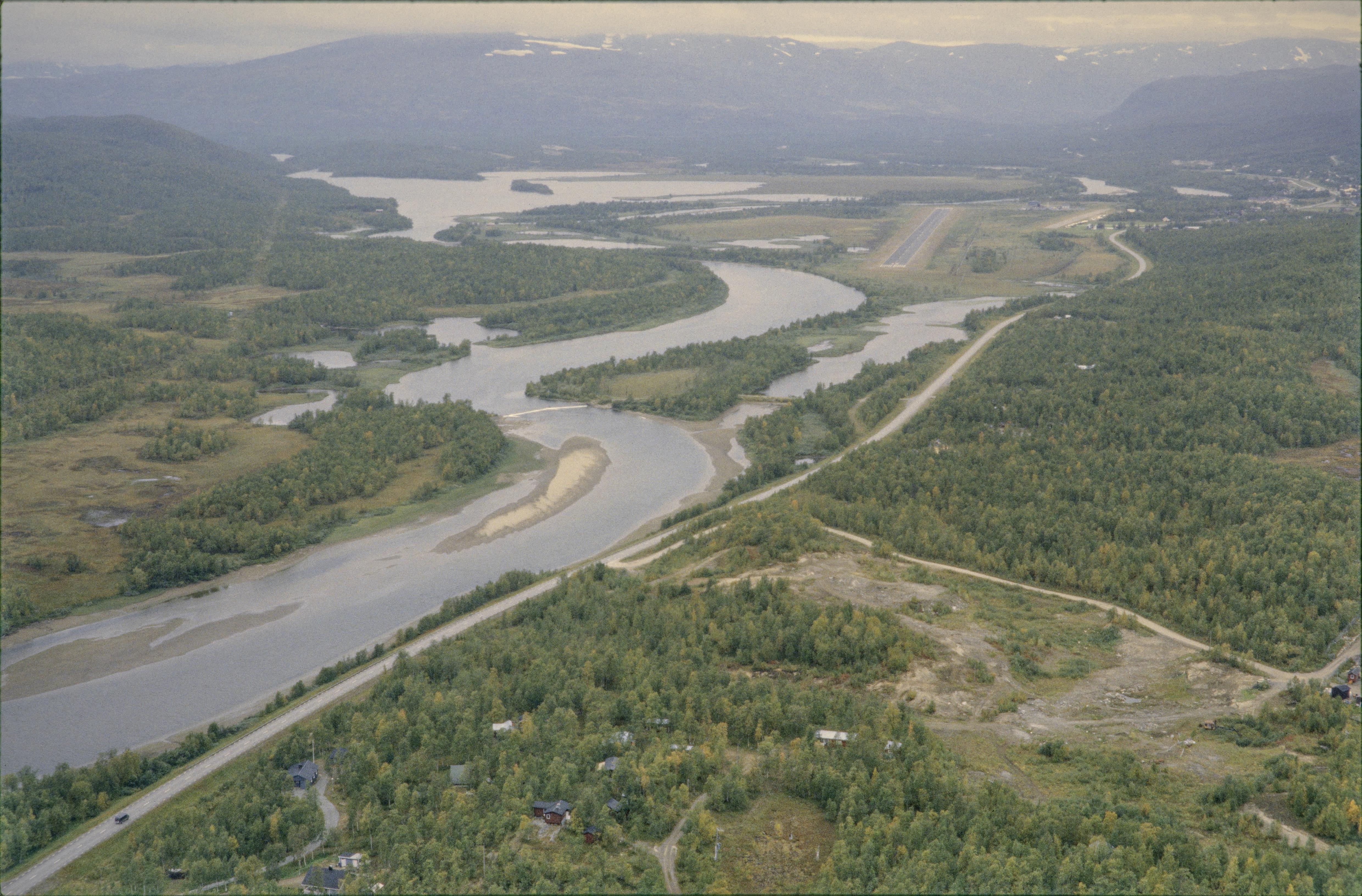 Beskrivning: Umeälvens delta söder om tätorten Hemavan (Bïerke). Till höger över bildens mitt Hemavans flygplats / flygfält och tätorten Hemavan (Bïerke). I tätorten till höger i bildens övre del fornlämningsplats RAÄnr Tärna 1142, 1143 m.fl. Bilden är tagen mot (väderstreck): NV