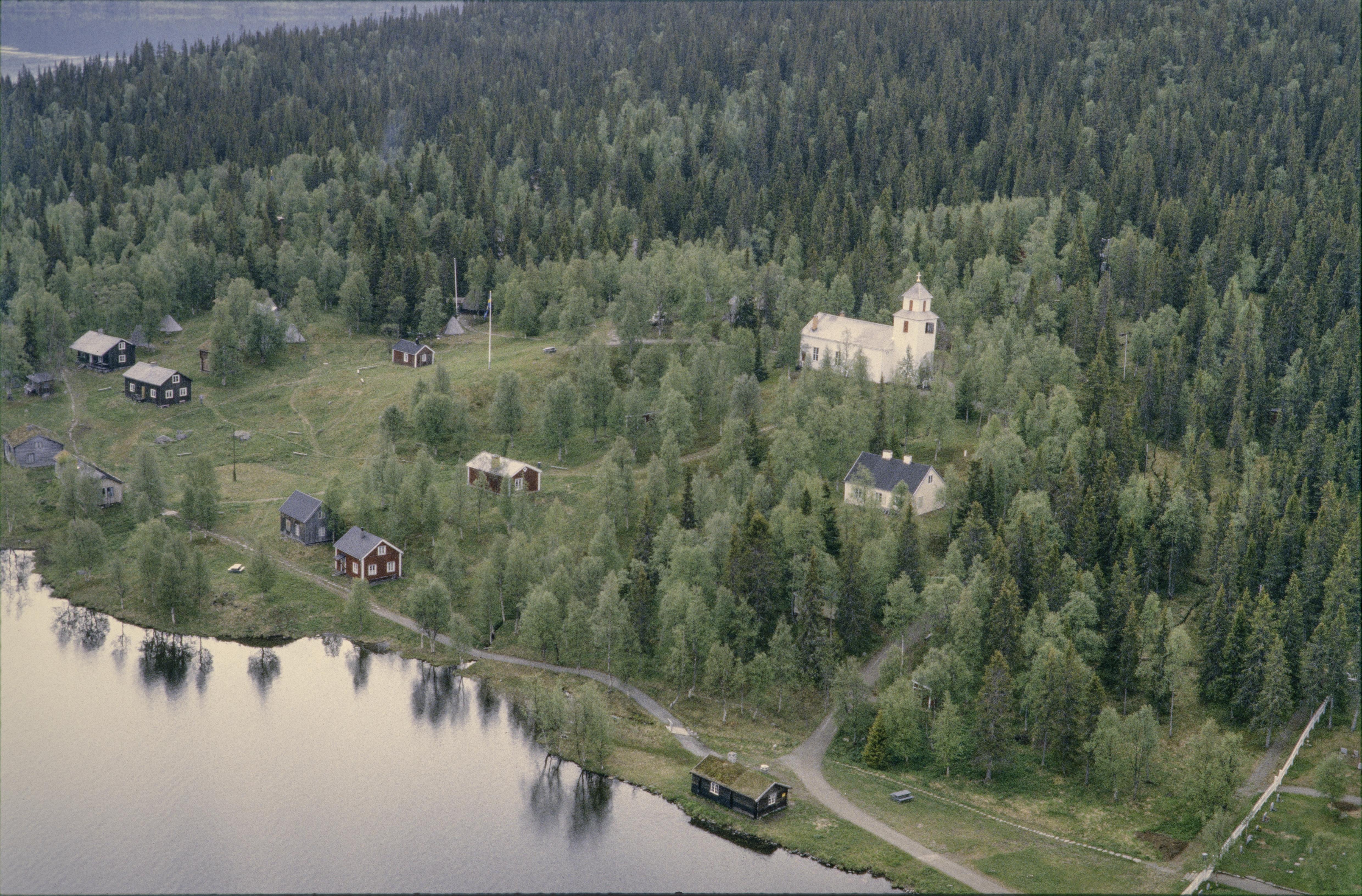 Beskrivning: Fatmomakke (Faepmie) kulturreservat och kyrkstad vid Fatmomakkeviken i norra ändan av Kultsjön (Gåaltoe). Fatmomakke kapell till höger om bildens mitt. Vid kyrkstaden boplats RAÄnr Vilhelmina 46:1 m.m. Bilden är tagen mot (väderstreck): SSO