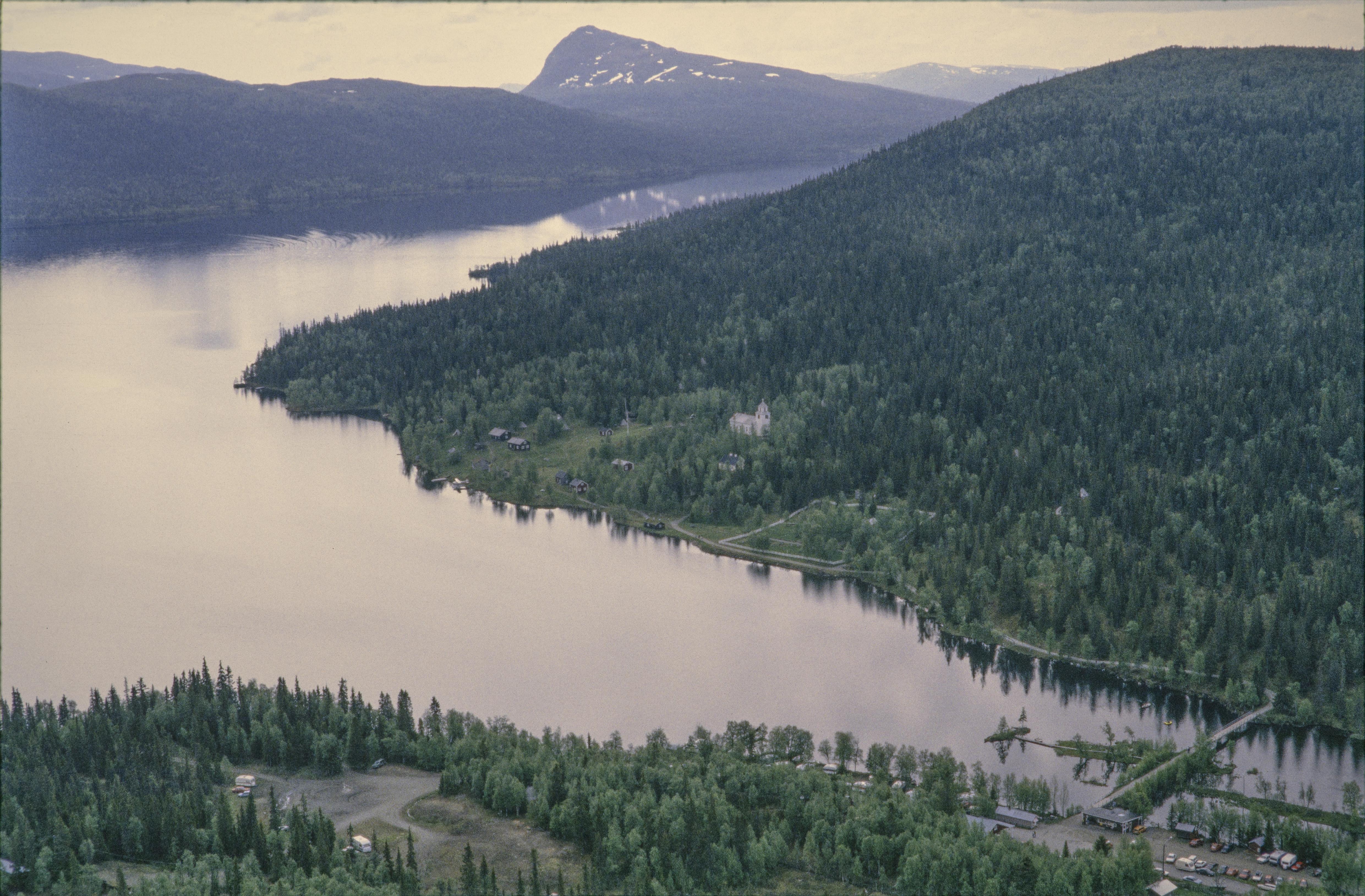 Beskrivning: Fatmomakke (Faepmie) kulturreservat och kyrkstad vid Fatmomakkeviken i norra ändan av Kultsjön (Gåaltoe). Fatmomakke kapell och kyrkstad i bildens mitt. Vid kyrkstaden boplats RAÄnr Vilhelmina 46:1 m.m. Bilden är tagen mot (väderstreck): SSO