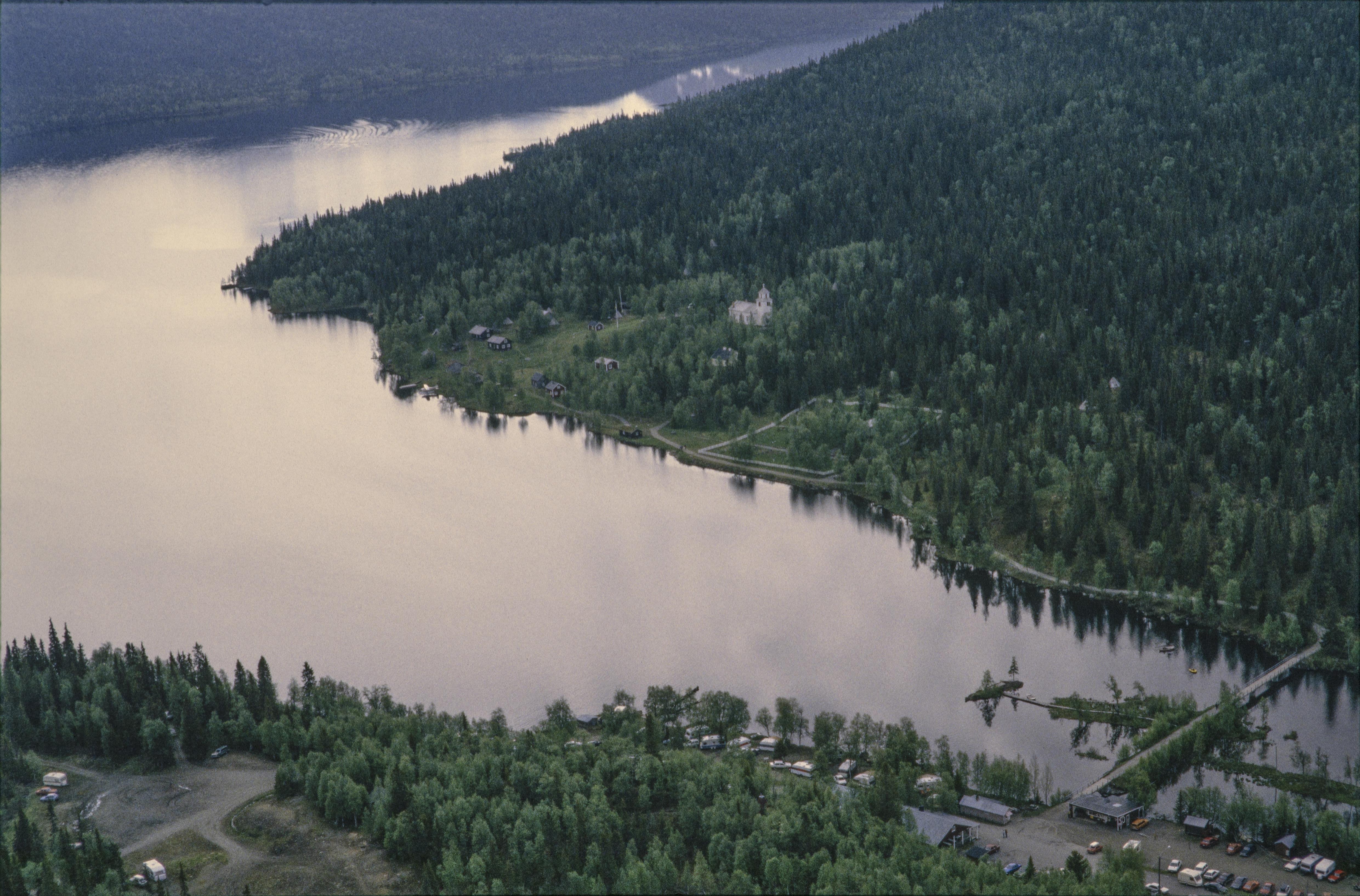 Beskrivning: Fatmomakke (Faepmie) kulturreservat och kyrkstad vid Fatmomakkeviken i norra ändan av Kultsjön (Gåaltoe). Fatmomakke kapell och kyrkstad vid bildens mitt. Vid kyrkstaden boplats RAÄnr Vilhelmina 46:1 m.m. Bilden är tagen mot (väderstreck): SSO