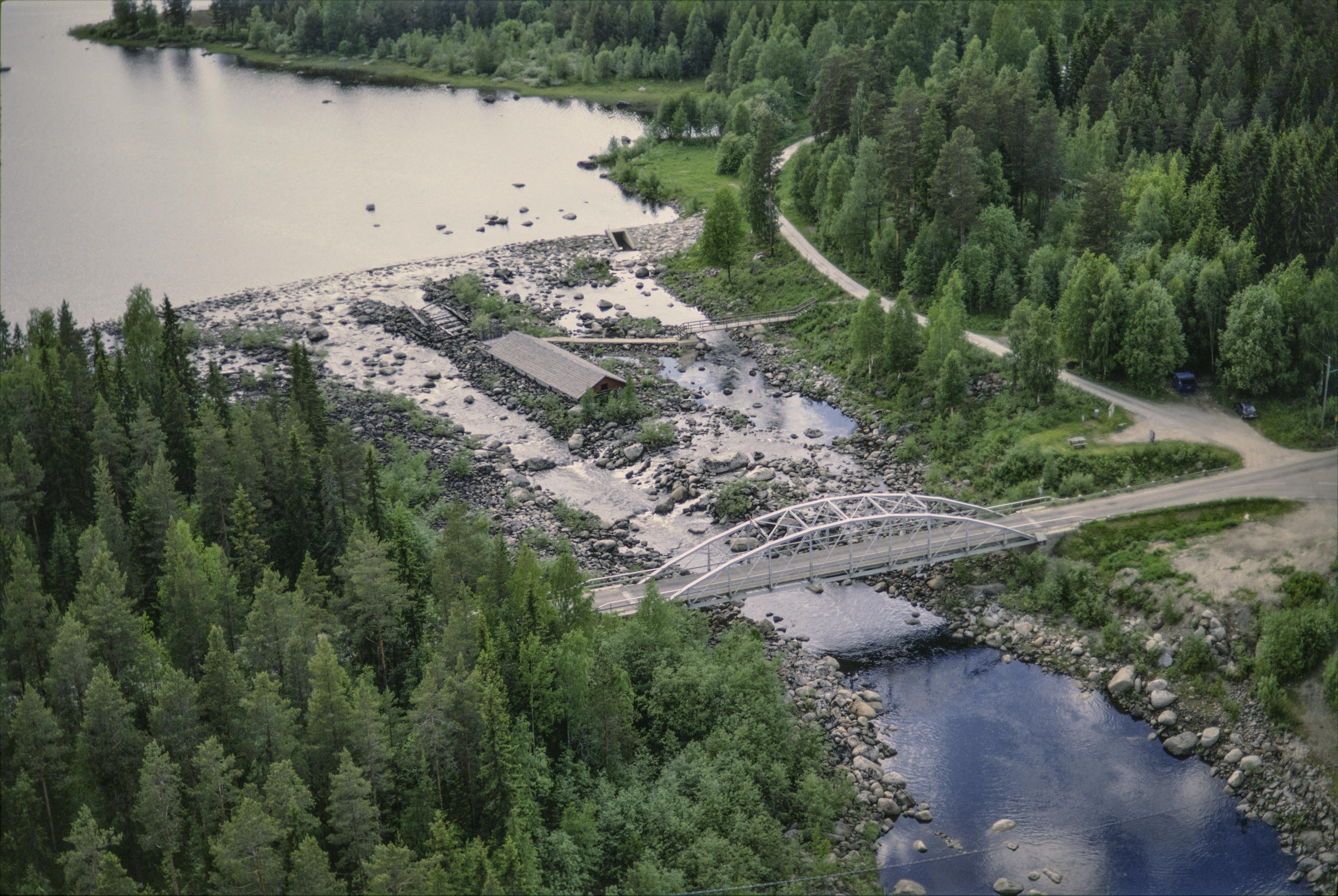 Beskrivning: Vägbro över ån Ljungan vid sjön Aldern, i området söder om Albybyn. Fiskhus i Ljungan över bildens mitt. Till vänster under bildens mitt fyndplats (slagg) RAÄnr Haverö 126:1. Bilden är tagen mot (väderstreck): VSV
