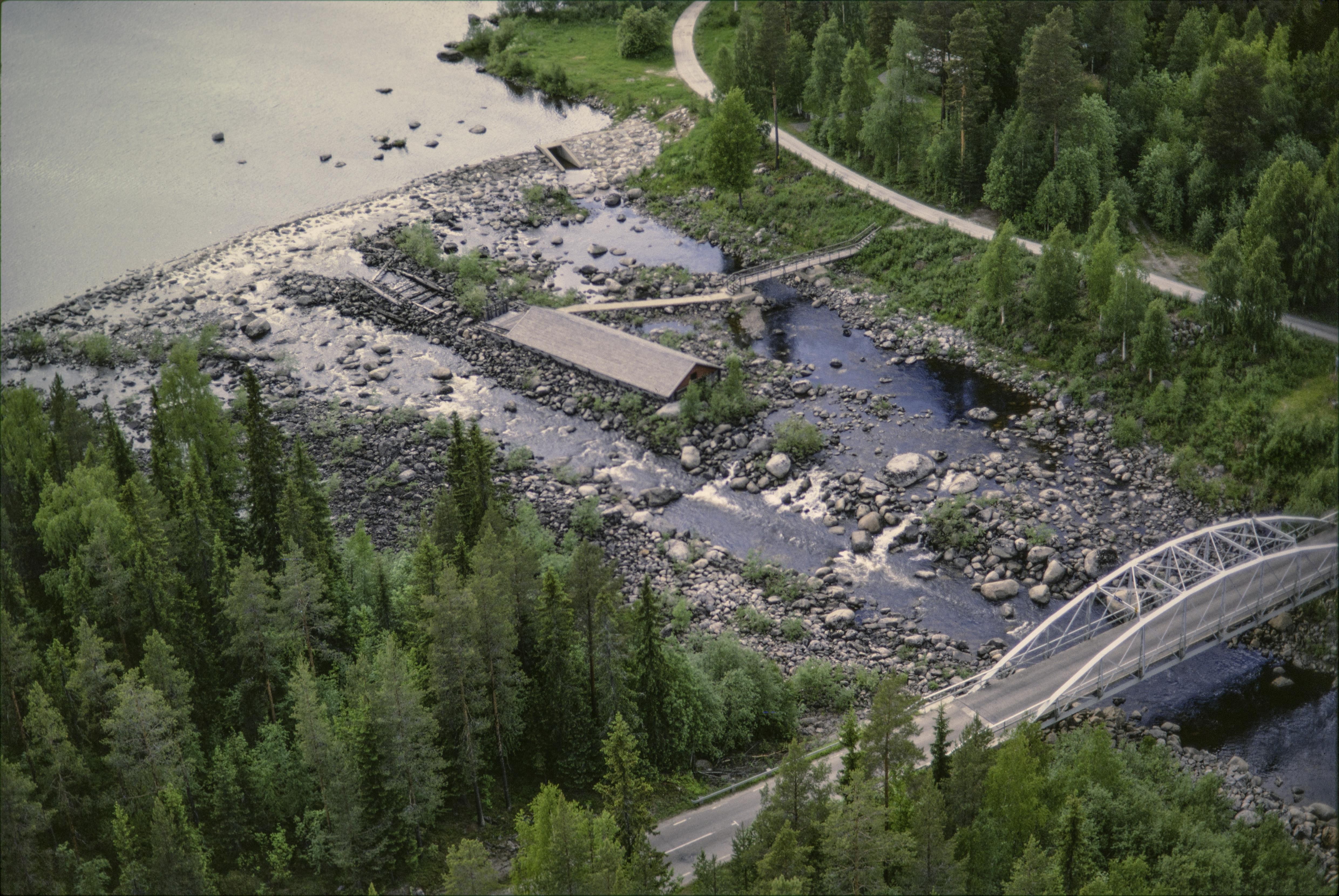 Beskrivning: Vägbro över ån Ljungan vid sjön Aldern, i området söder om Albybyn. Fiskhus i Ljungan över bildens mitt. Till vänster under bildens mitt fyndplats (slagg) RAÄnr Haverö 126:1. Bilden är tagen mot (väderstreck): VSV