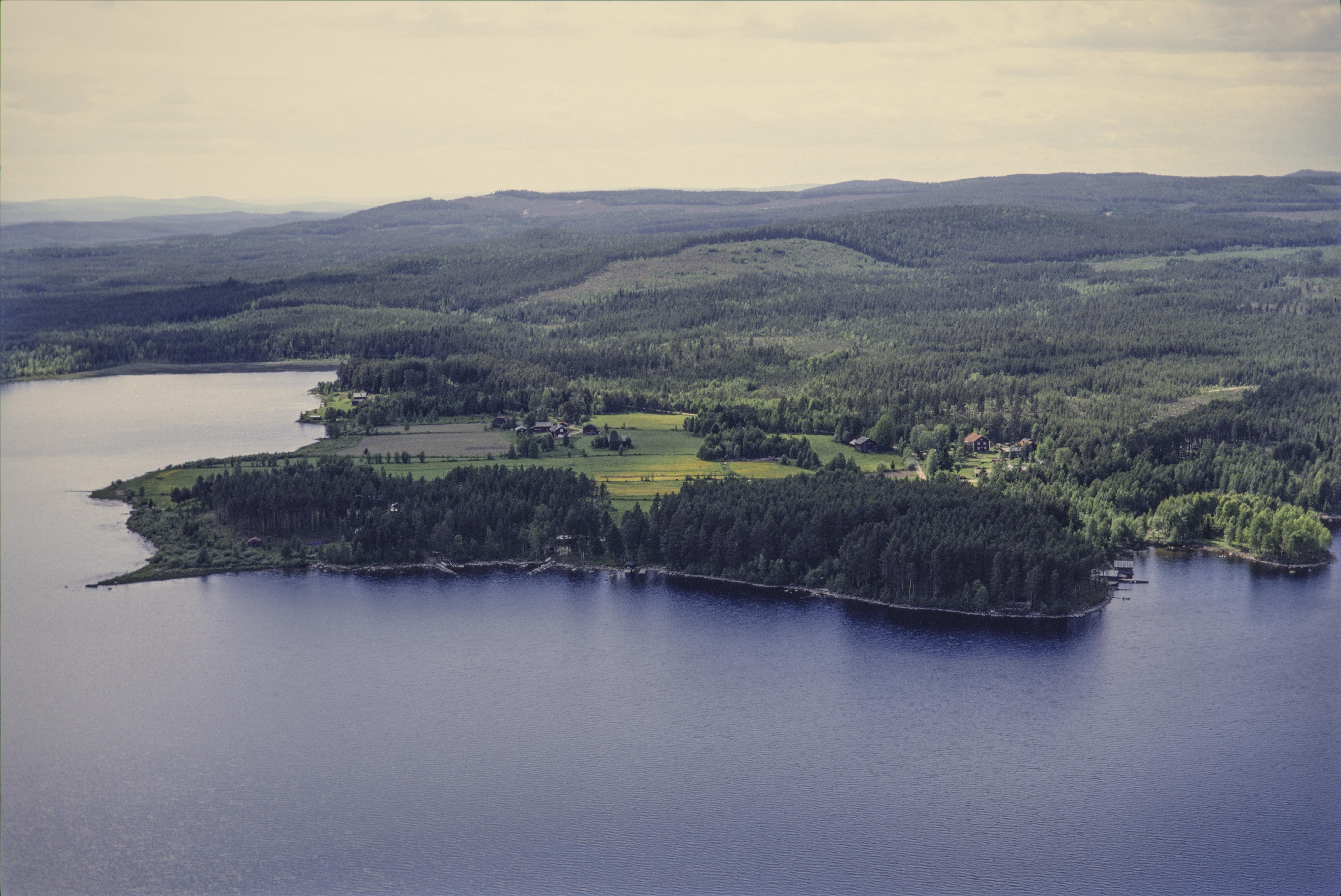 Beskrivning: Vassnäs by vid Holmsjön (i bildens nedre del) och ån Ljungan (till vänster). På stranden till vänster om bildens mitt boplatser RAÄnr Haverö 159:1-3. Bilden är tagen mot (väderstreck): V