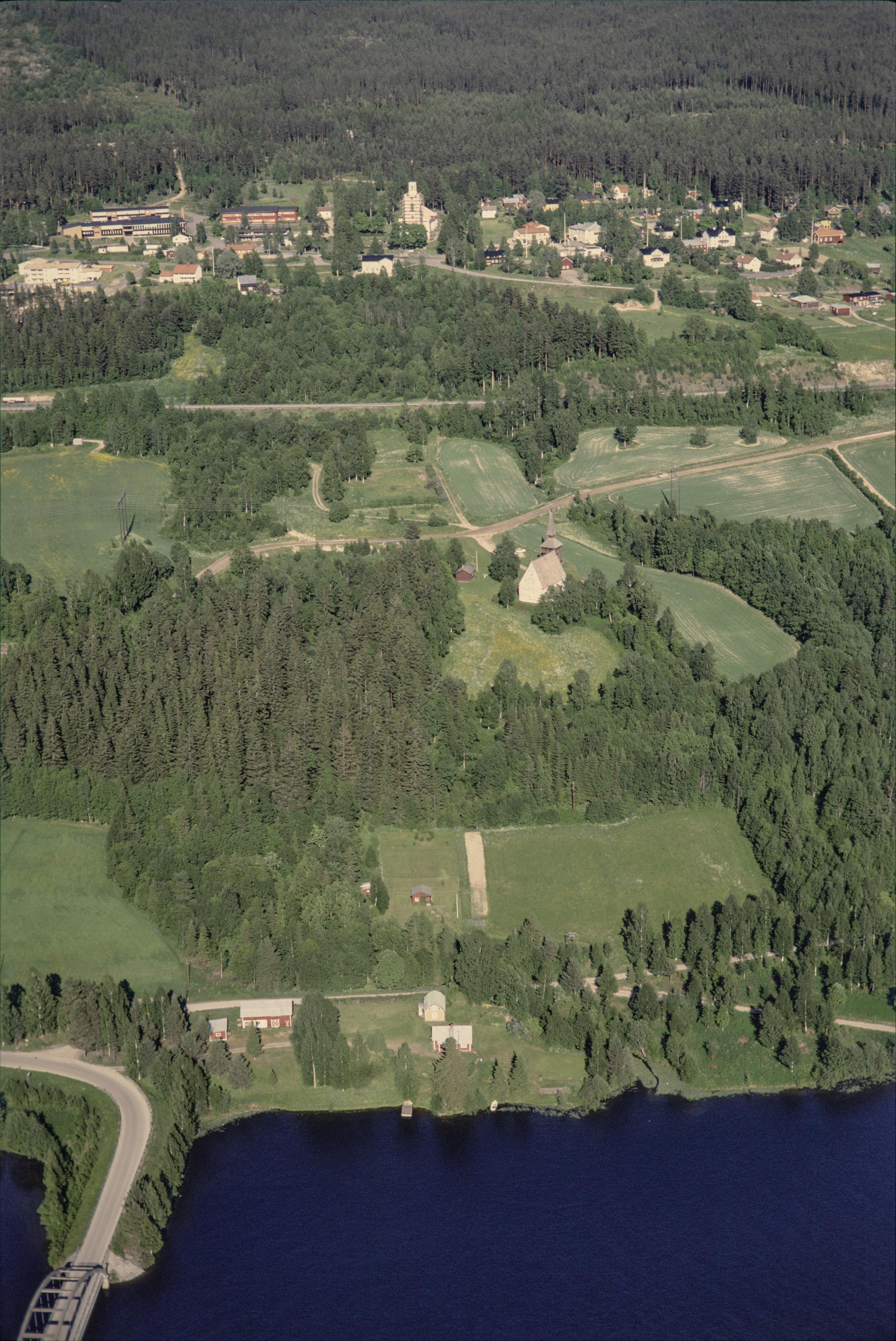 Beskrivning: Indalsälvens dalgång vid Lidens kyrkby. Lidens gamla kyrka med gravplats och minnesmärke RAÄnr Liden 117:1-3 vid bildens mitt. Lidens nya kyrka över bildens mitt. Bilden är tagen mot (väderstreck): Ö