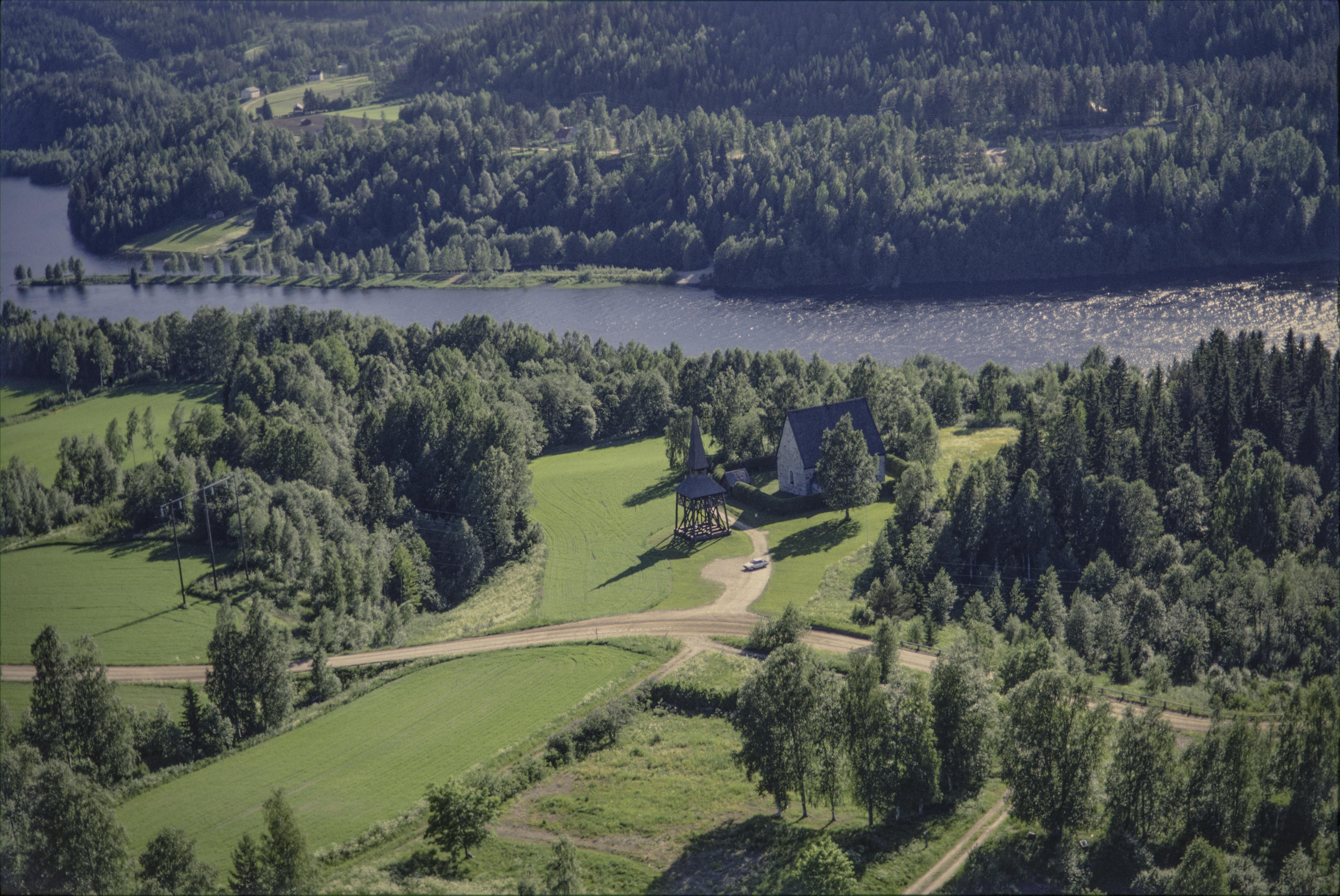 Beskrivning: Indalsälvens dalgång vid Lidens kyrkby. Lidens gamla kyrka med gravplats och minnesmärke RAÄnr Liden 117:1-3 vid bildens mitt. Bilden är tagen mot (väderstreck): V