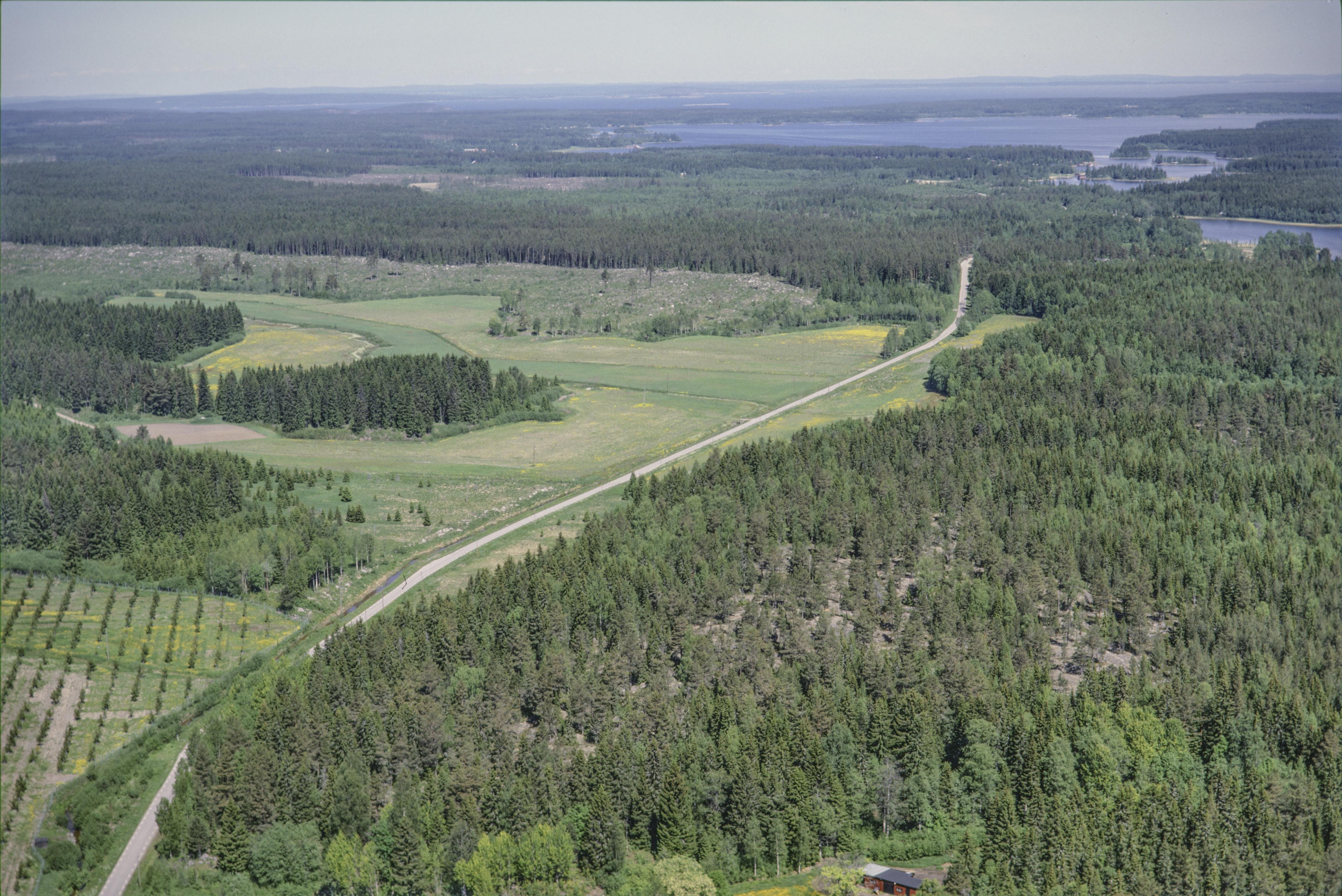 Beskrivning: Området Storänget norrväst om Galtströms bruk. Skalmsandsberget till höger. Uppe i bildens högra hörn vägmärke RAÄnr Njurunda 442:1 i Åbodarna by vid havsviken Lubban, Njurundakusten. Bilden är tagen mot (väderstreck): N