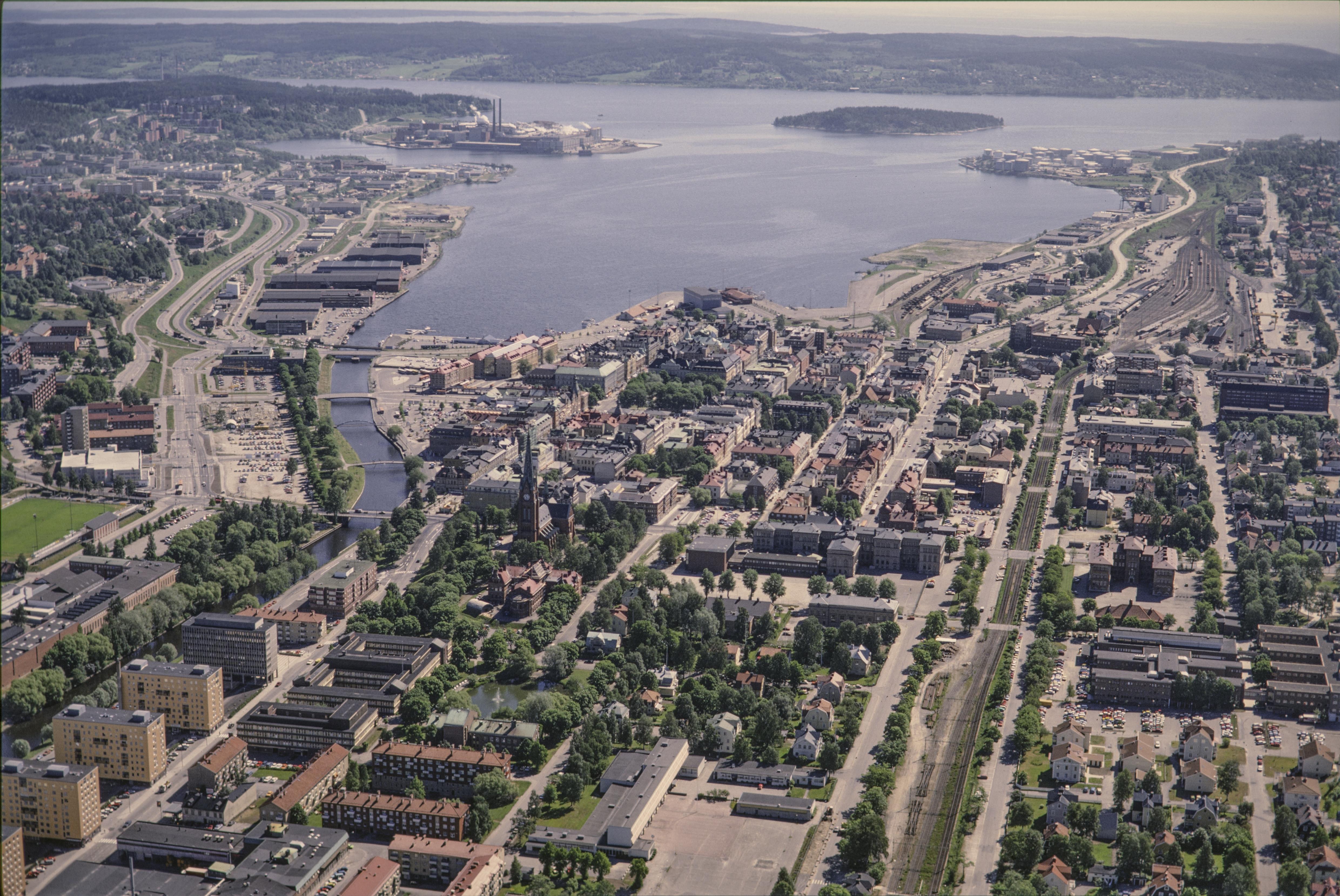 Beskrivning: Sundsvall stad. I bildens nedre del området Stenstaden och Selångeråns utlopp i Sundsvallsfjärden. Till vänster under bildens mitt Gustav Adolfs kyrka i stadslager RAÄnr Sundsvall 21:1. Bilden är tagen mot (väderstreck): Ö