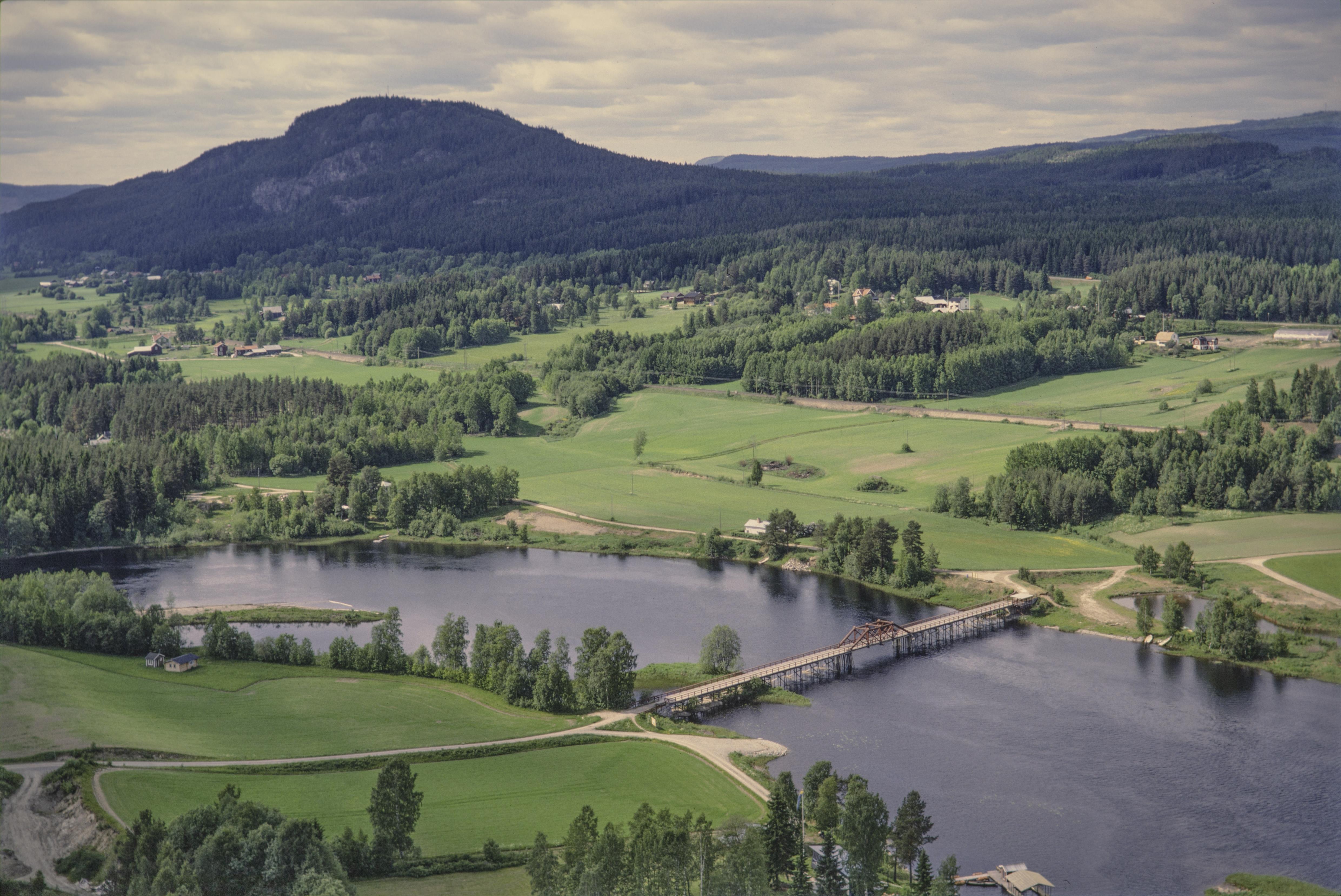 Beskrivning: Ån Ljungans dalgång väster om Torpsjön och Fränsta tätort. Nere till vänster Viknäset. Till höger under bildens mitt träbro RAÄnr Torp 110:1. Bilden är tagen mot (väderstreck): VNV
