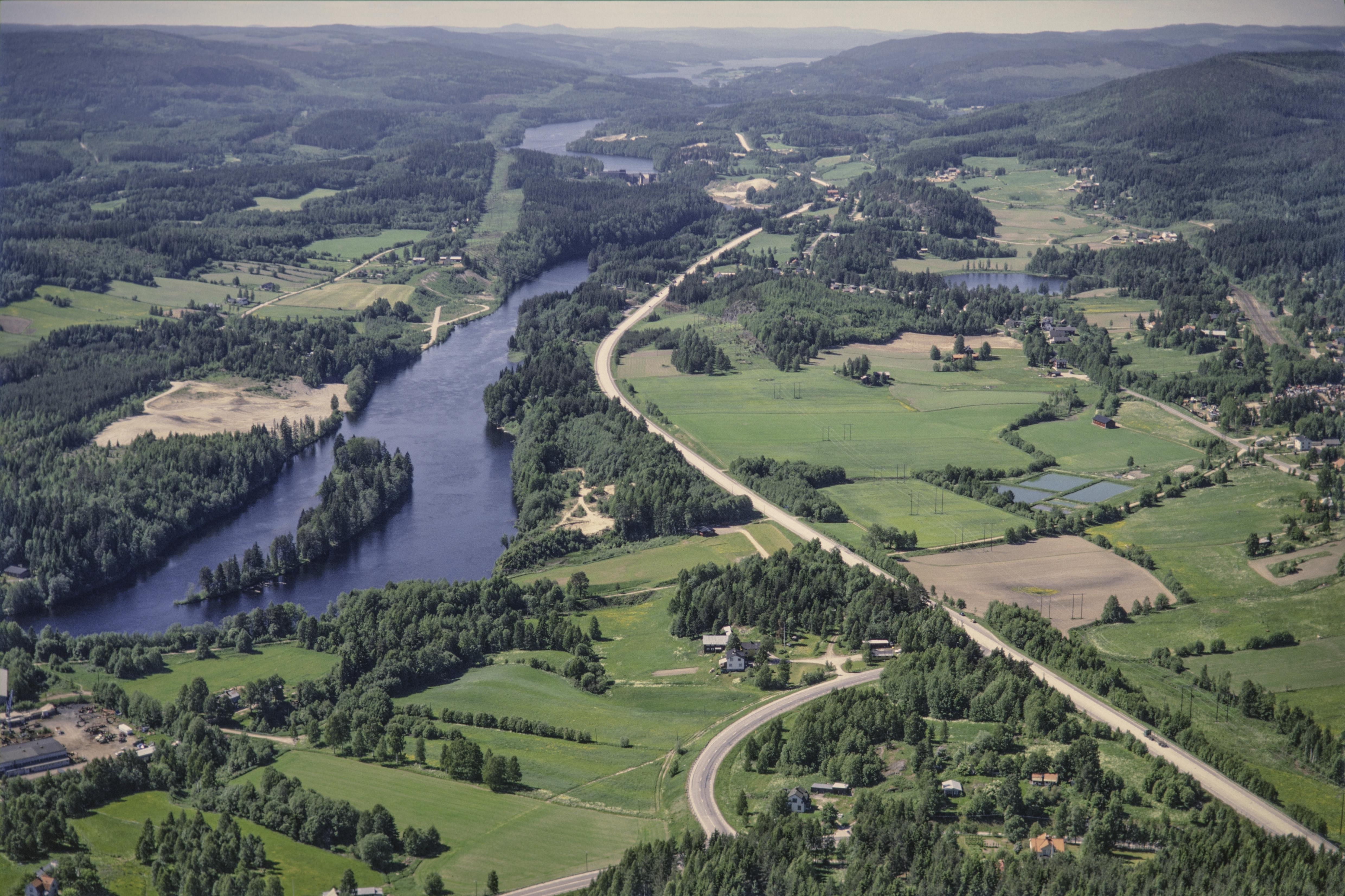 Beskrivning: Ån Ljungans dalgång i fornlämningsområdet mellan byarna Vattjom (i bildens nedre del) och Rude (över bildens mitt). Mellan vägen (Finnhuvudvägen) och ån ett smalt område med gravar; under bildens mitt gravfält RAÄnr Tuna 175:1 och i bildens mitt Starkotters grav RAÄnr Tuna 176:1. Bilden är tagen mot (väderstreck): V