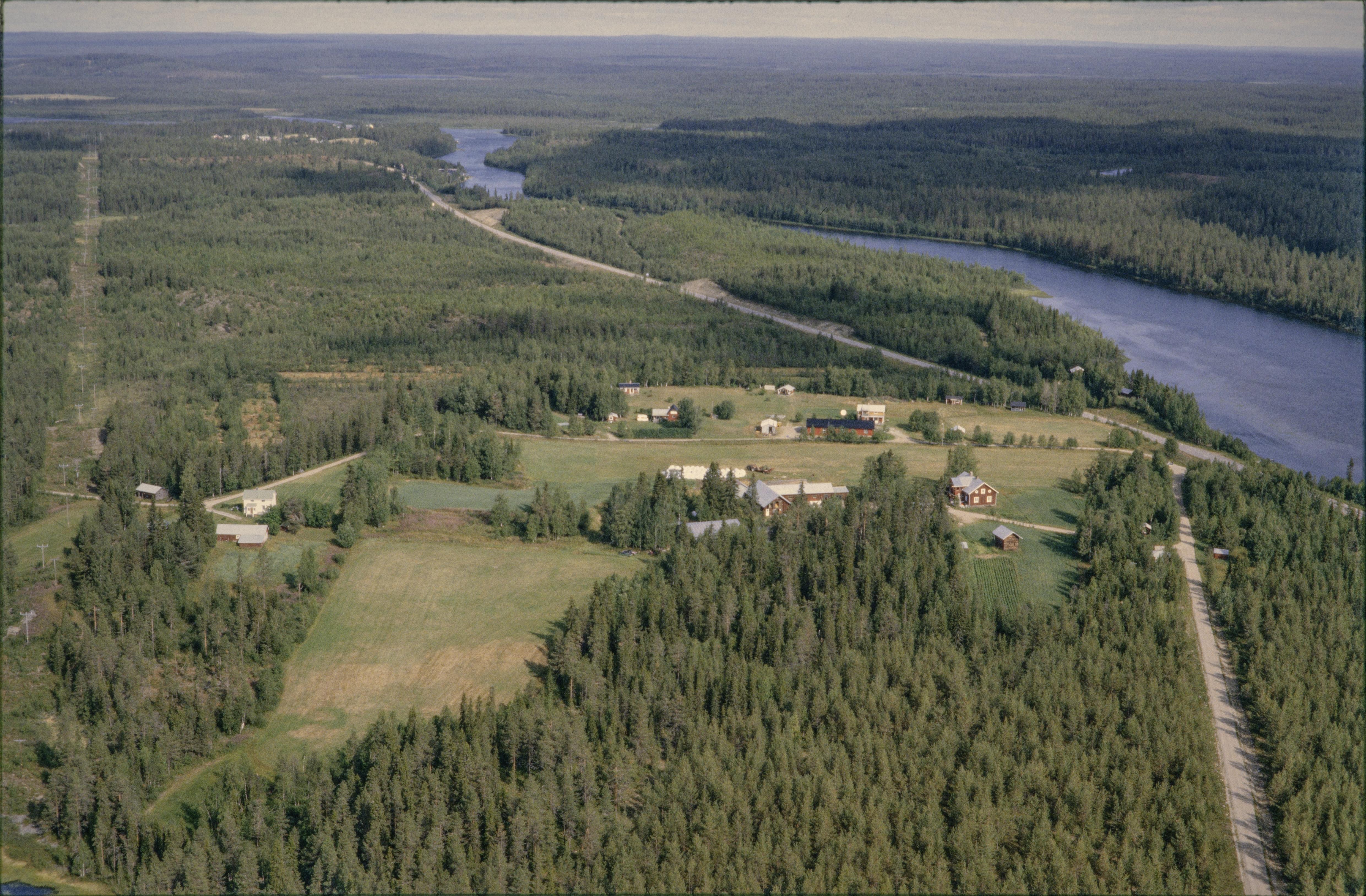 Beskrivning: Torneälven i Tornedalen. Vid bildens mitt Tornefors bruk (Tornionkoskin). Kolningsanläggning RAÄnr Junosuando 346 till höger över bildens mitt. Bilden är tagen mot (väderstreck): NNV