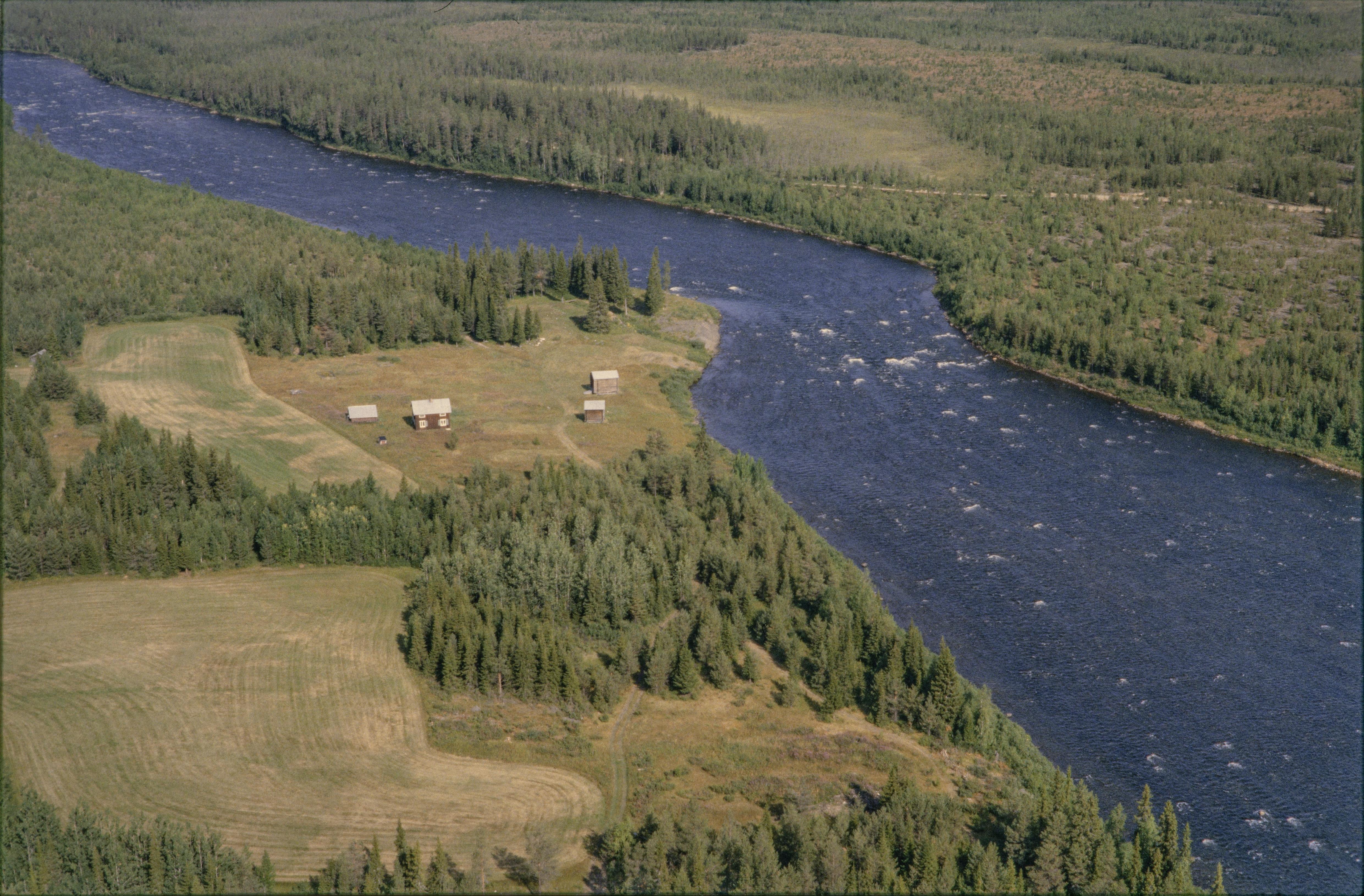 Beskrivning: Palokorva bruk vid Torneälven i Tornedalen. Vid bildens mitt bytomt RAÄnr Junosuando 183:1. Över bildens mitt gravplats och hyttlämning RAÄnr Junosuando 1:1-2. Bilden är tagen mot (väderstreck): N