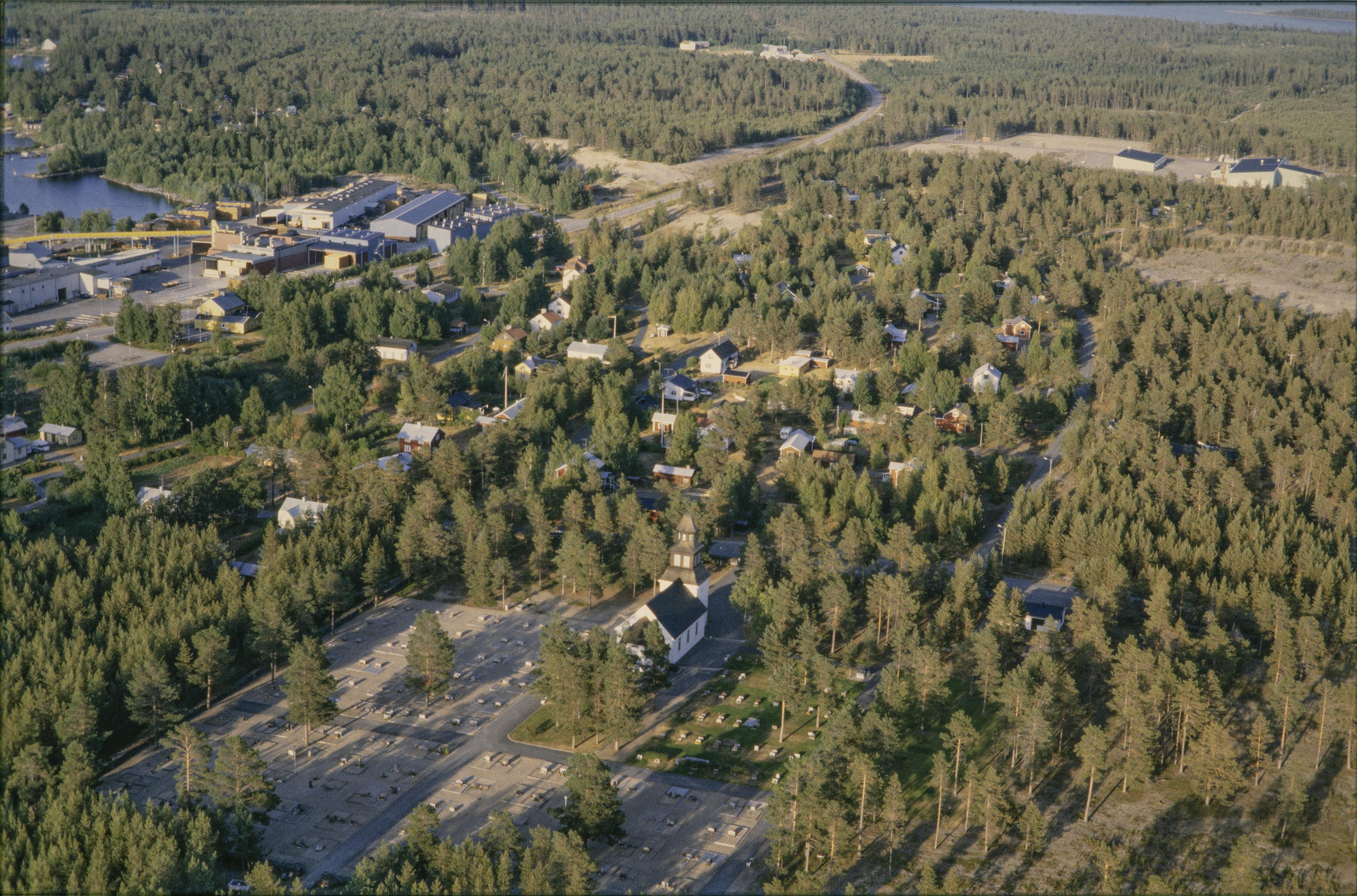 Beskrivning: Seskarö tätort, kyrkby och sågbrukssamhälle i norra delen av ön Seskarö (Seittenkaari) i Haparanda skärgård. Seskarö kyrka under bildens mitt. Bilden är tagen mot (väderstreck): ONO