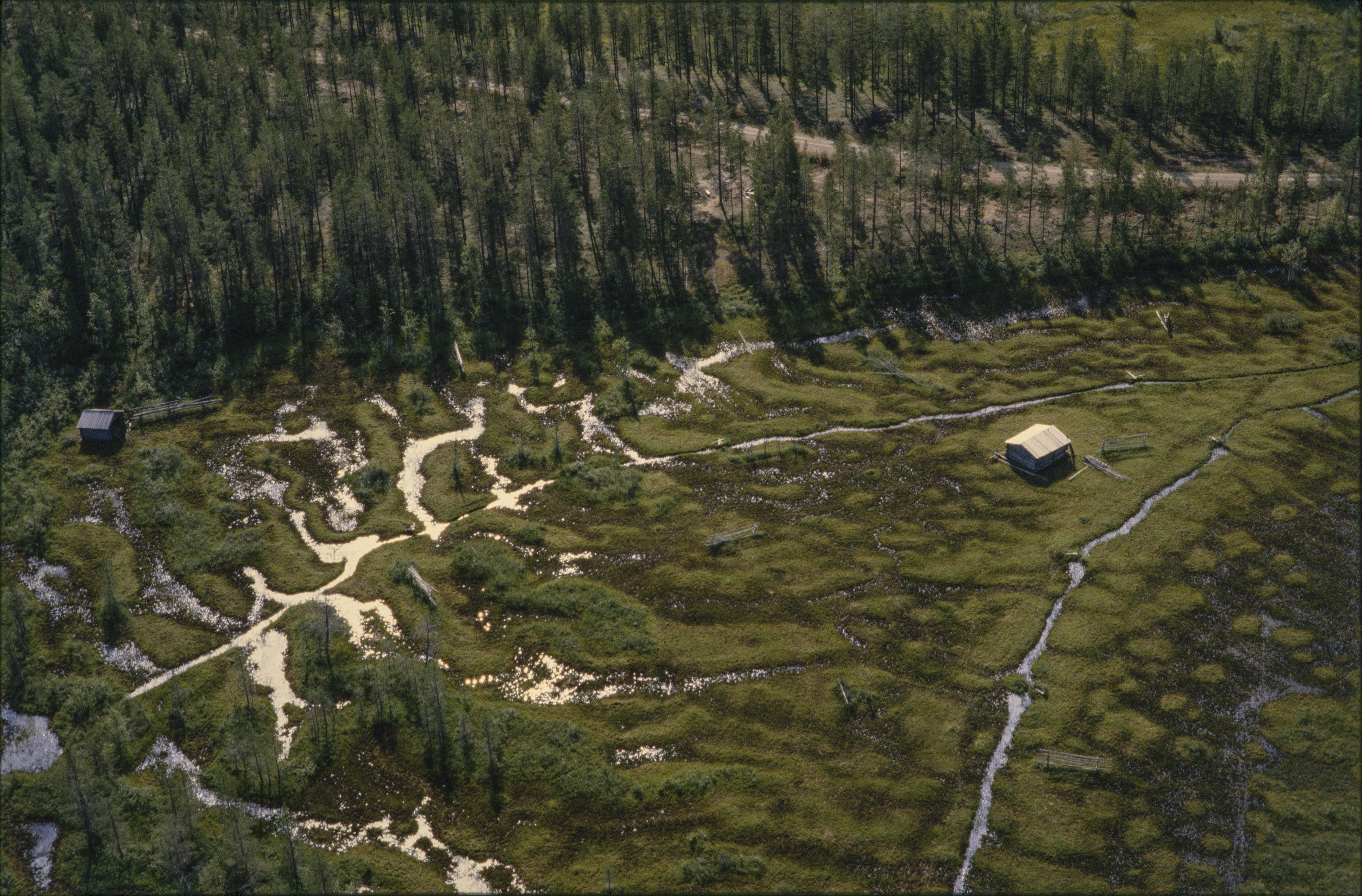 Beskrivning: Ån Kaunisjokis dalgång. Ängslador på slåttermyr i området Saarikoskenvaara. Bilden är tagen mot (väderstreck): SO