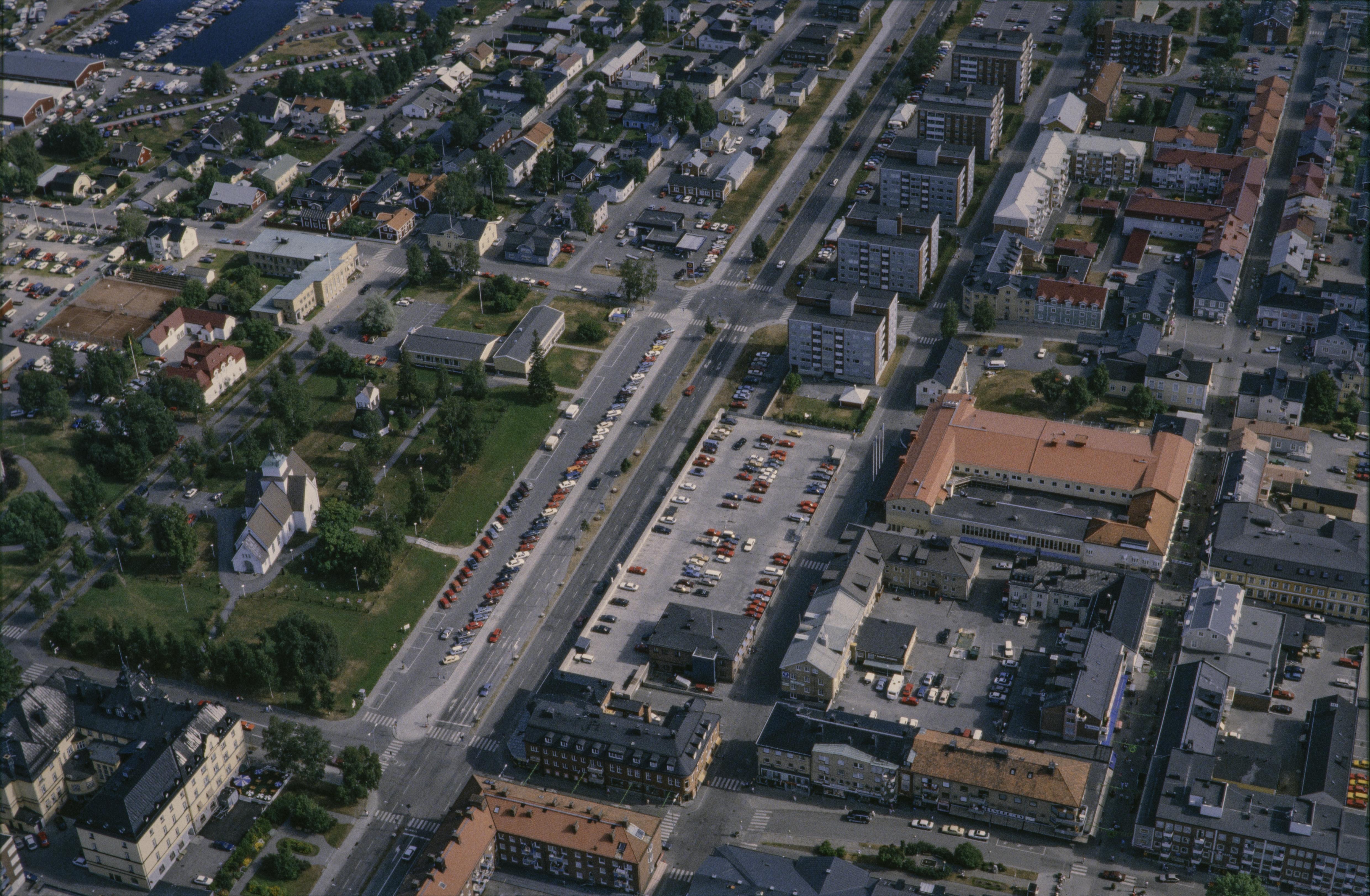 Beskrivning: Piteå stad / tätort. Stadskärnan och stadslager RAÄnr Piteå socken 226:1. Piteå Stads kyrka till vänster under bildens mitt. Bilden är tagen mot (väderstreck): Ö