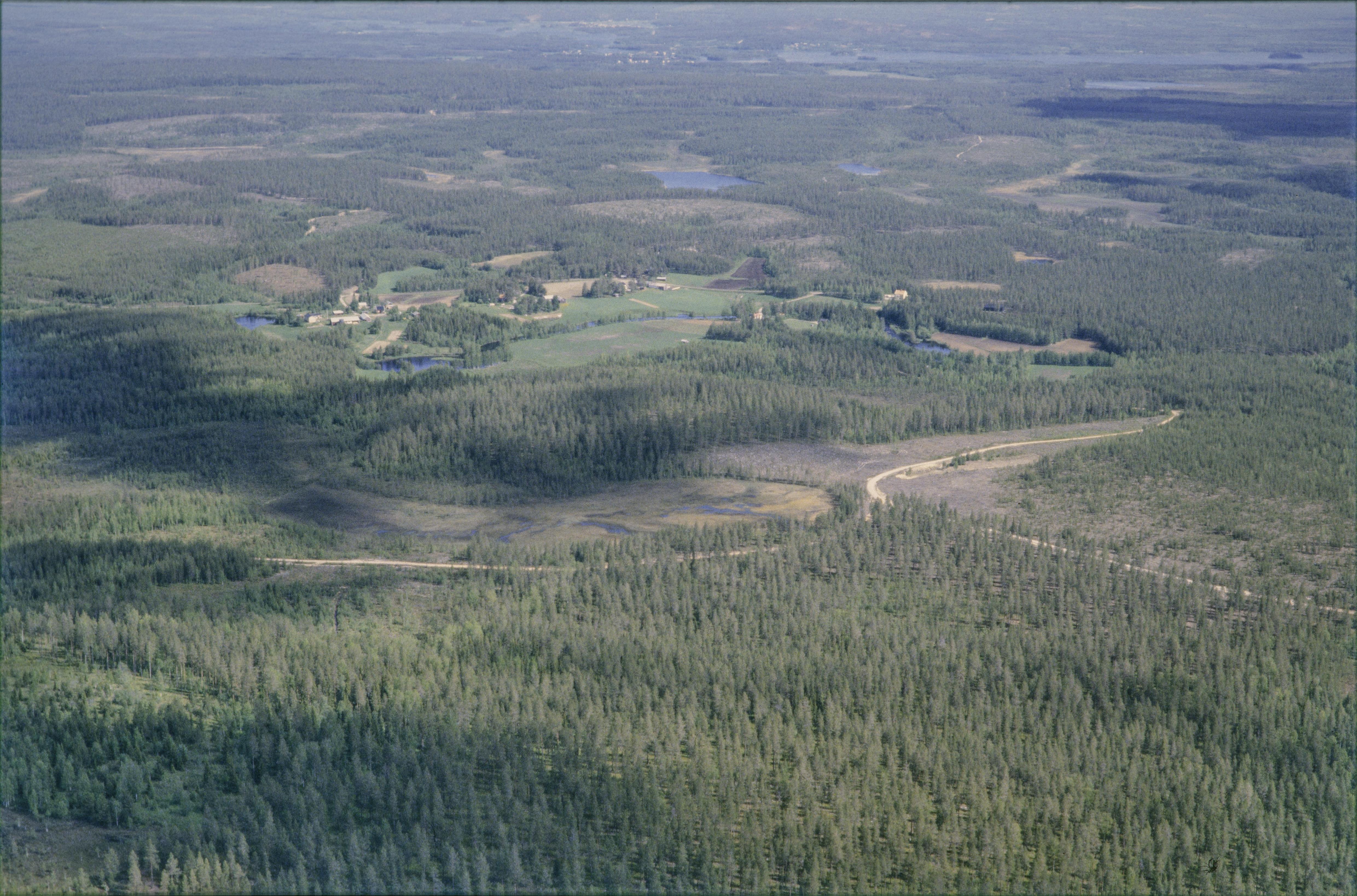Beskrivning: Vid bildens mitt område med fångstgropar och boplatser RAÄnr Töre 309:1-5, 464:1, 418:1, m.m. Över bildens mitt byn Långsel vid Töreälven. Till höger om bildens mitt Fattenborgs naturreservat. Bilden är tagen mot (väderstreck): NO