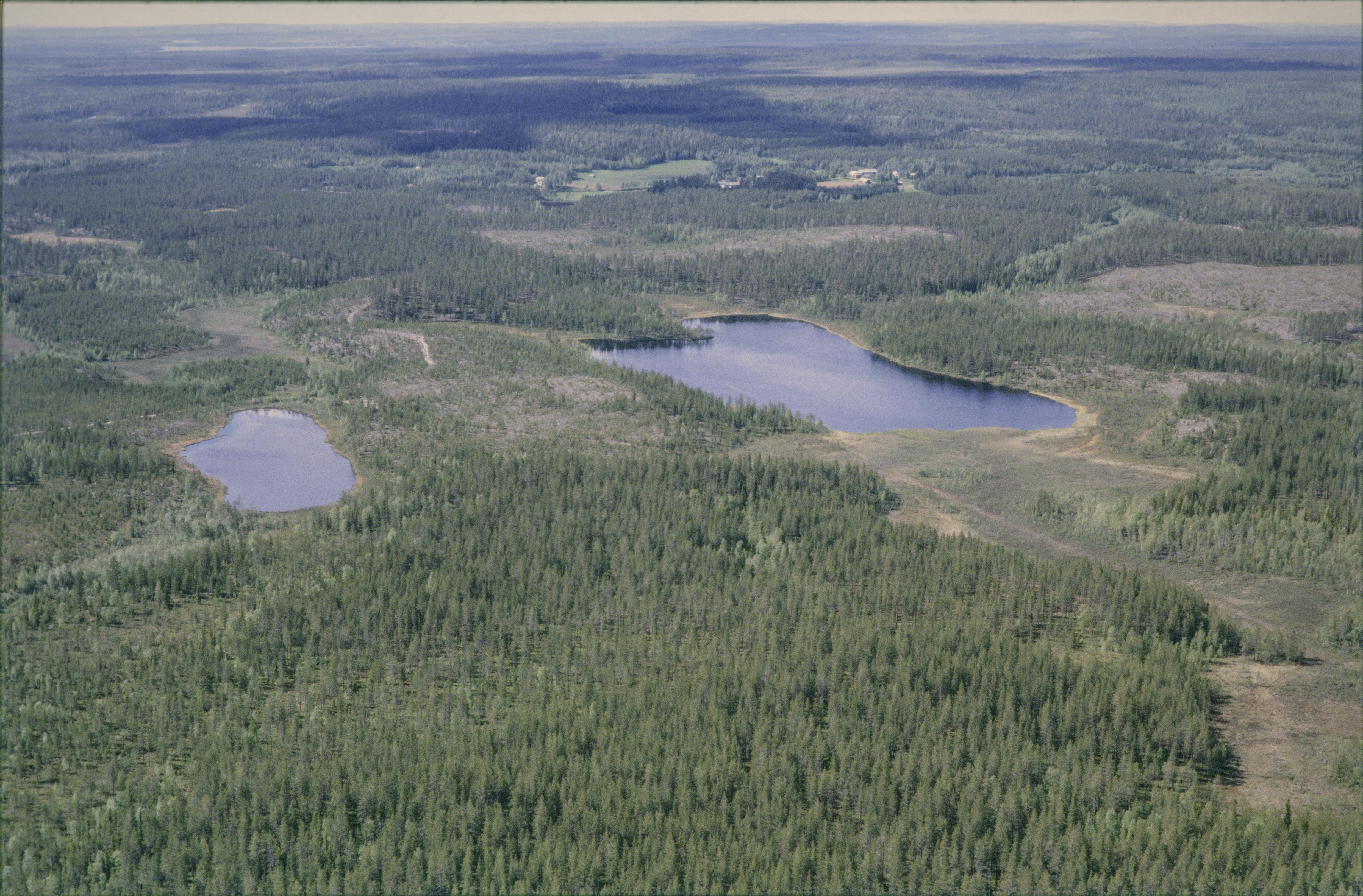 Beskrivning: Norra delen av byn Långsel vid Töreälven. Vid bildens mitt boplatsgrop RAÄnr Töre 391:1, 408:1, 411:1. m.m. i områdena vid Mossarottjärnen och Stortjärnen. Fattenborgs naturreservat till vänster över bildens mitt. Bilden är tagen mot (väderstreck): SV