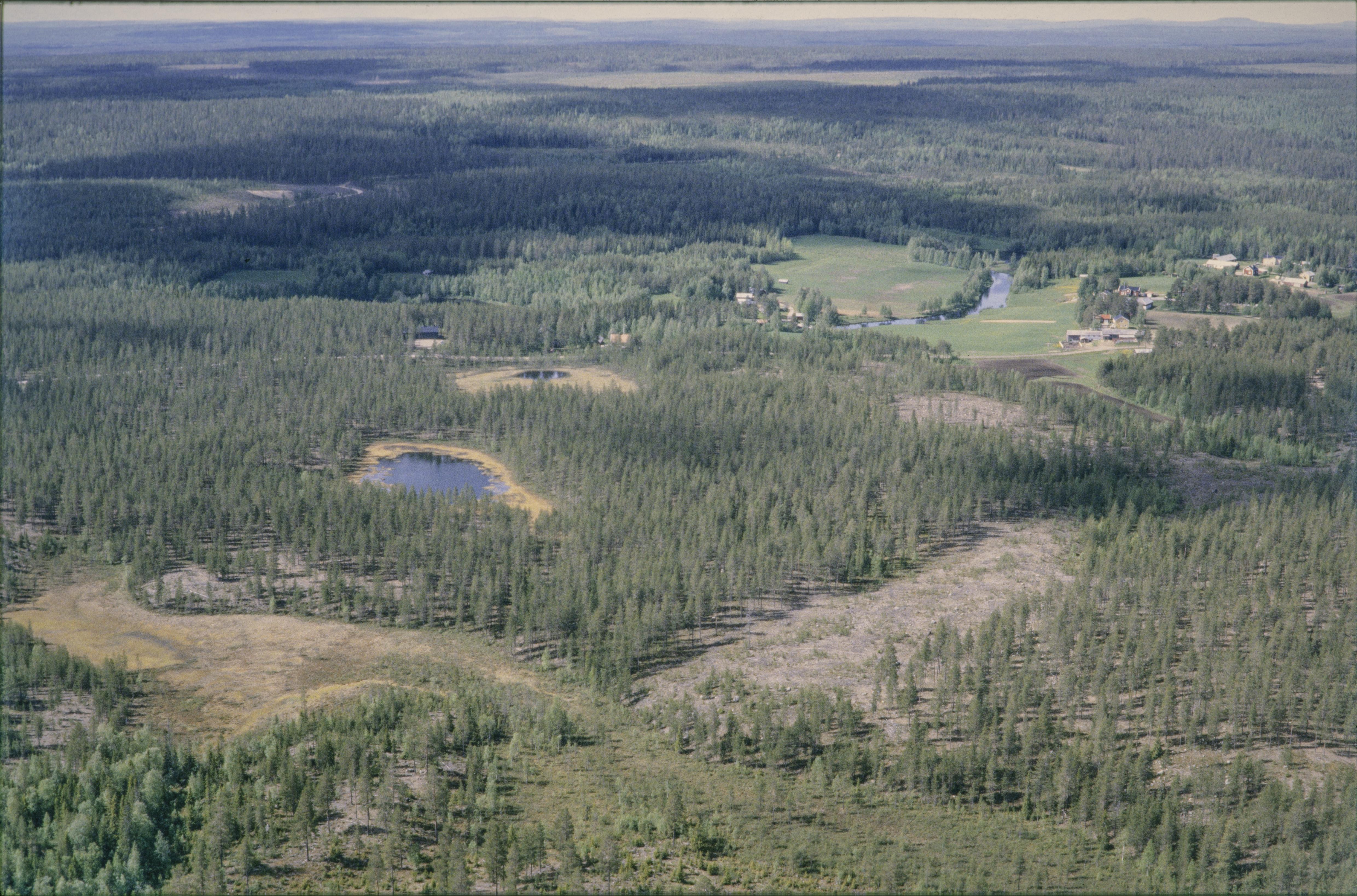 Beskrivning: Fattenborgs naturreservat och fornlämningsområde vid Töreälven. Vid bildens mitt Bortre Lilltjärnen och Lilltjärnen. Vid tjärnen boplatsgrop RAÄnr Töre 341:1, 405:1, gravfält 320:1, härd 415:1. m.m. Uppe till höger byn Långsel. Bilden är tagen mot (väderstreck): SV