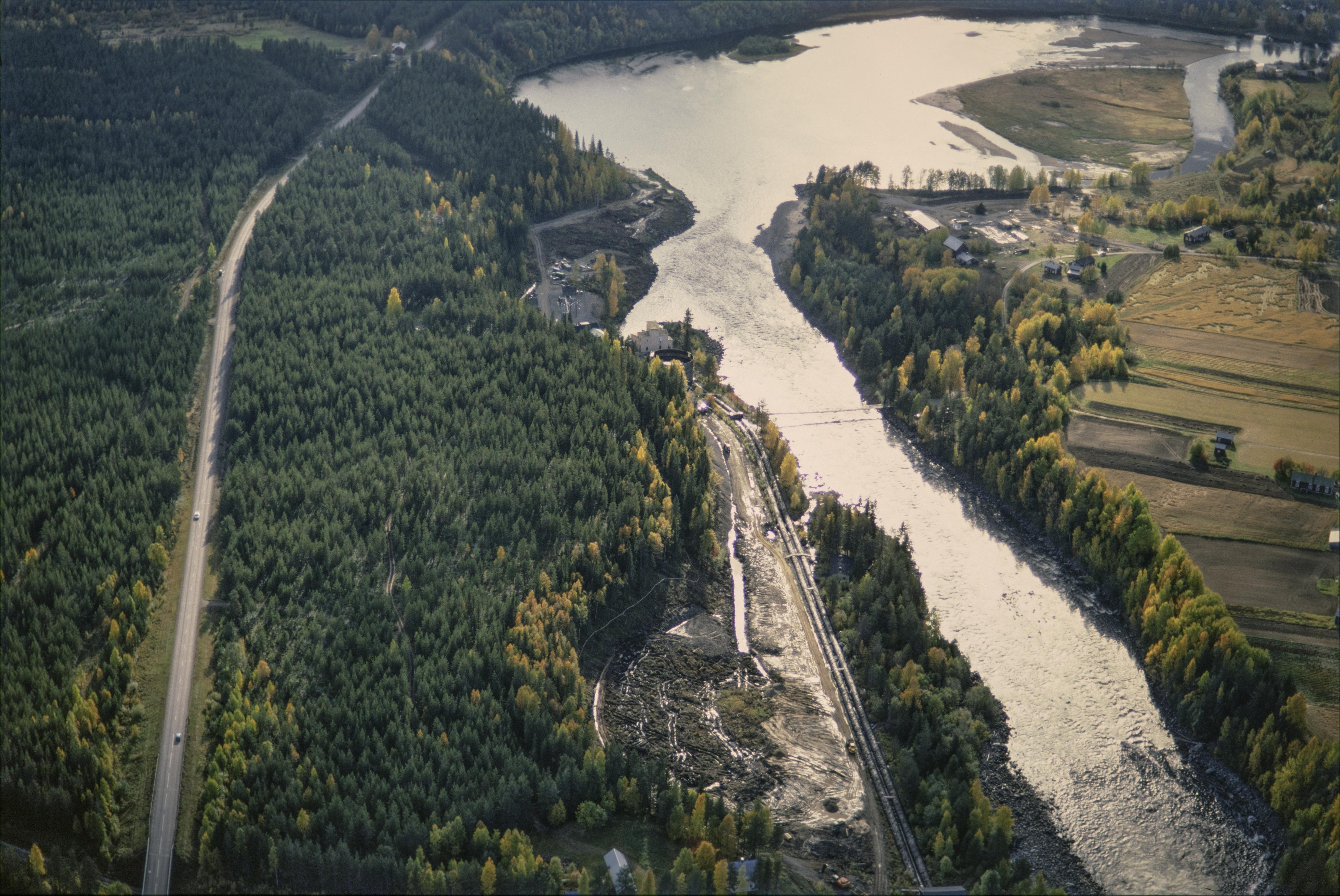 Beskrivning: Sikfors kraftverk i Piteälven. Uppe till höger Sikfors by och bytomt RAÄnr Piteå socken 379:1 och 380:1. Bilden är tagen mot (väderstreck): SSV
