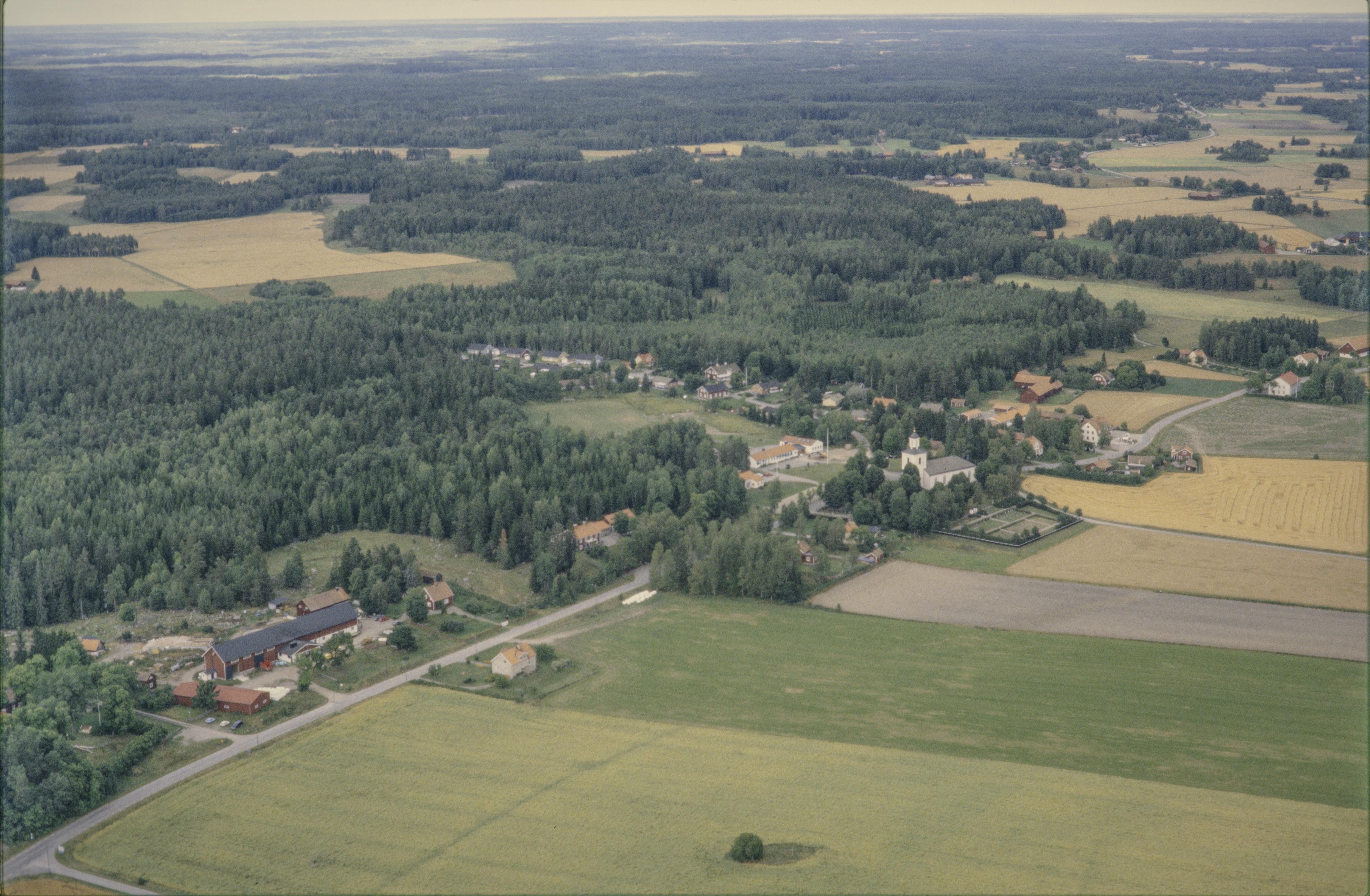 Beskrivning: Huddunge kyrka och kyrkby i Vretaåns dalgång. I bildens nedre del kyrkoruin RAÄnr Huddunge 14:1. Bilden är tagen mot (väderstreck): N