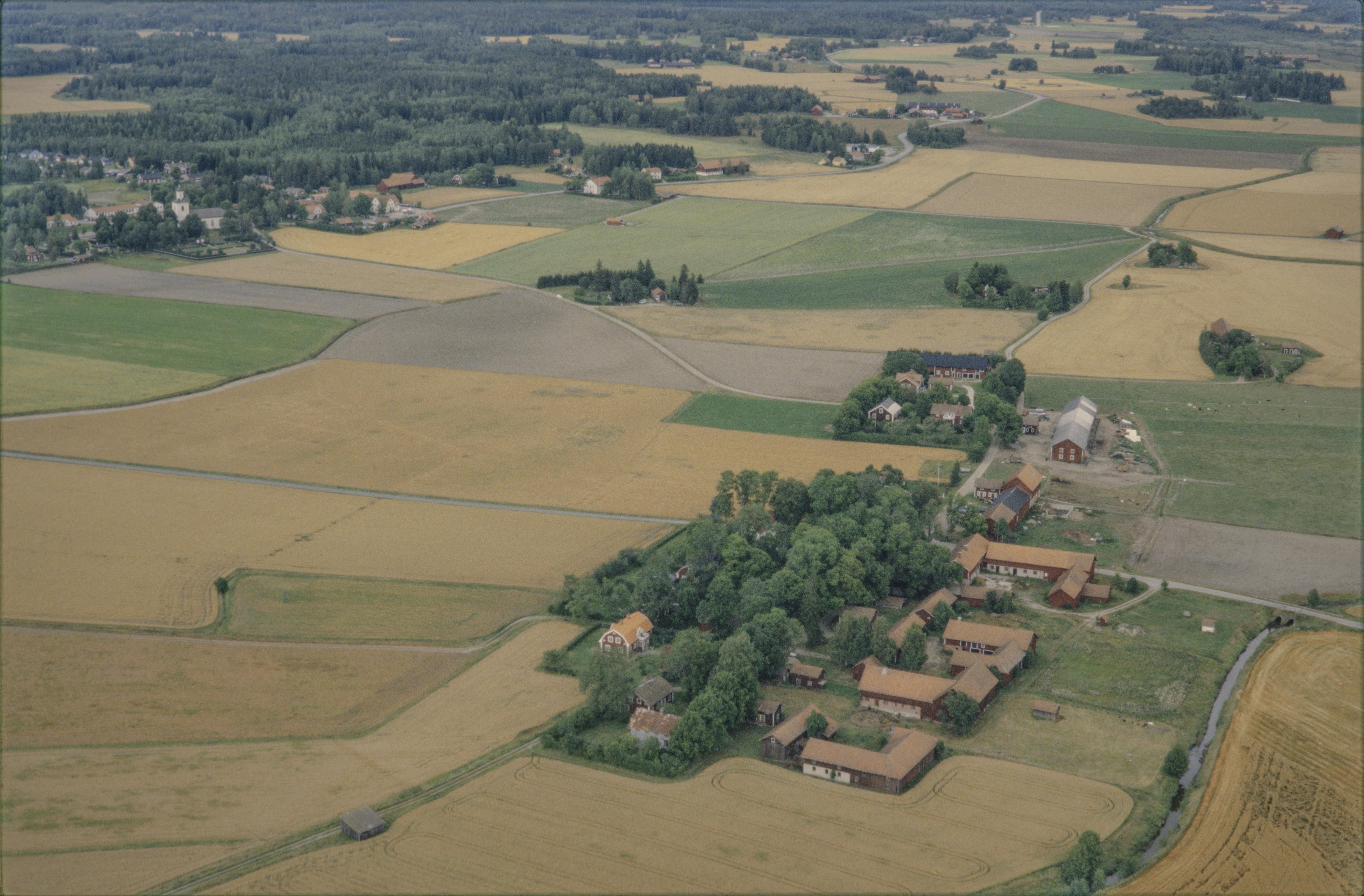 Beskrivning: Vretaåns dalgång. Vid bildens mitt radbyn Huddungeby. Uppe till vänster Huddunge kyrka och kyrkby. Bilden är tagen mot (väderstreck): NNO