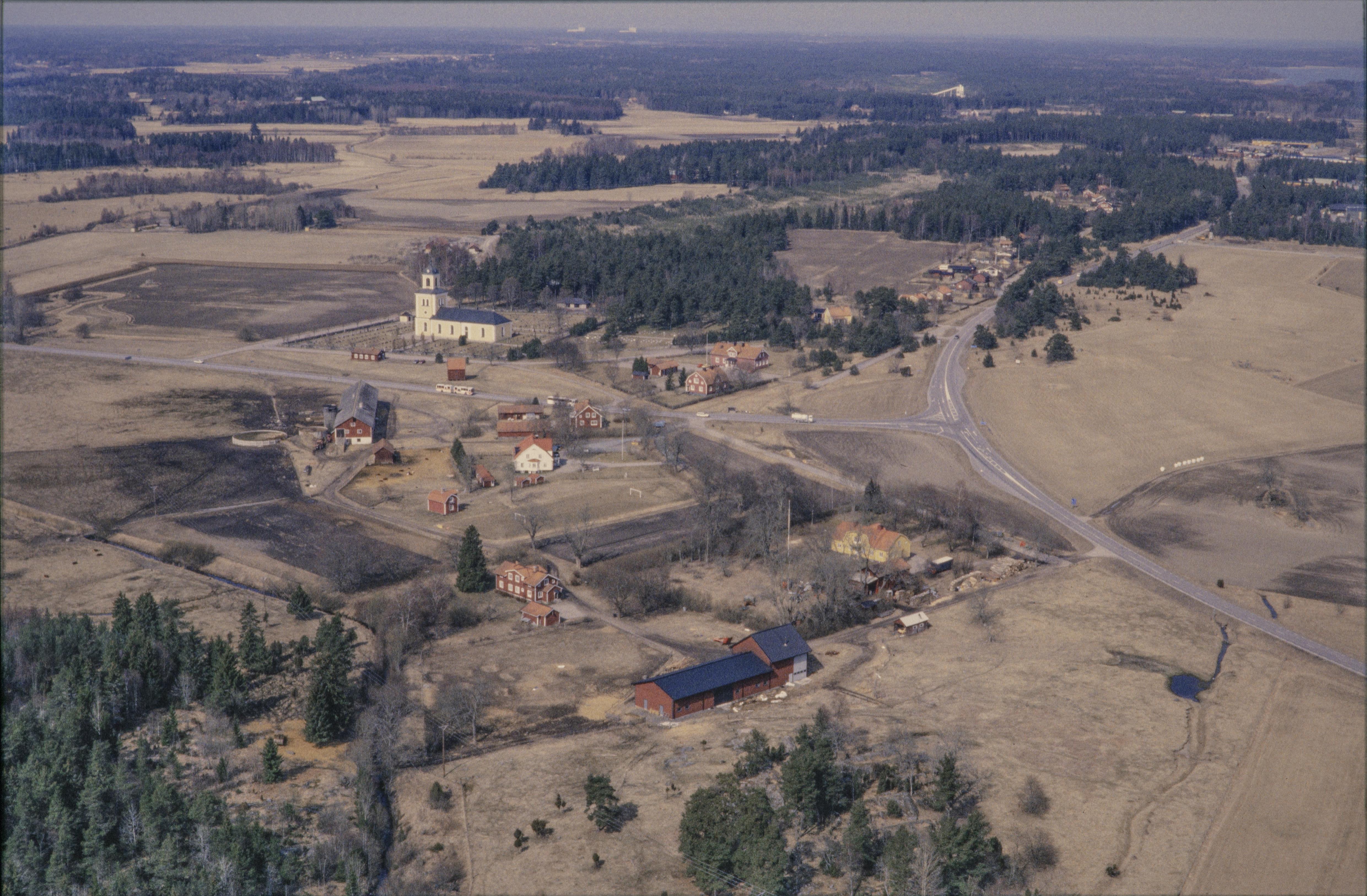Beskrivning: I bildens nedre del bytomt RAÄnr Börstil 268:1-2 m.fl. Till vänster över bildens mitt Börstils kyrka vid ån Norsdiket. Bilden är tagen mot (väderstreck): NV