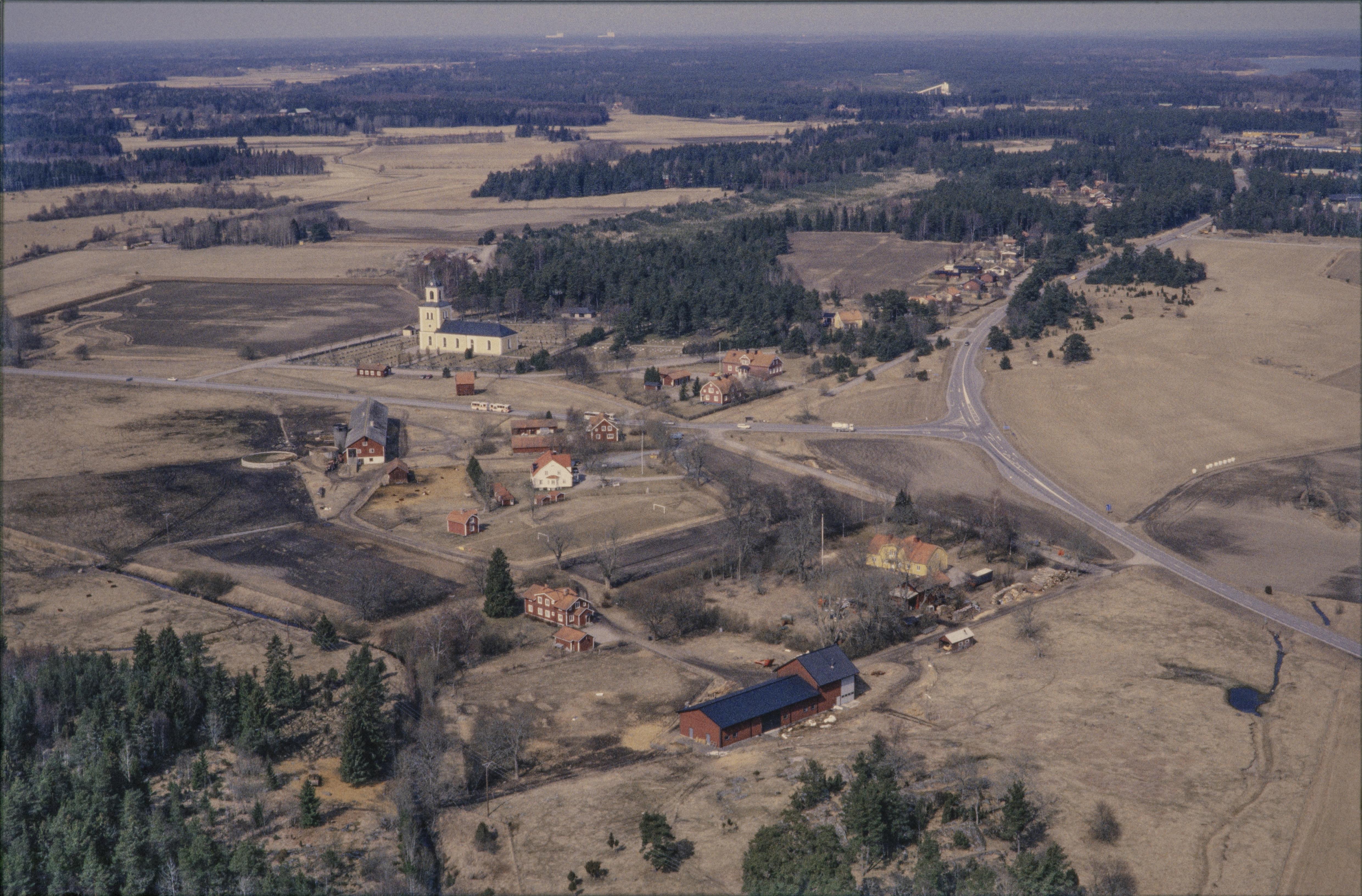 Beskrivning: I bildens nedre del bytomt RAÄnr Börstil 268:1-2 m.fl. Till vänster över bildens mitt Börstils kyrka vid ån Norsdiket. Bilden är tagen mot (väderstreck): NV