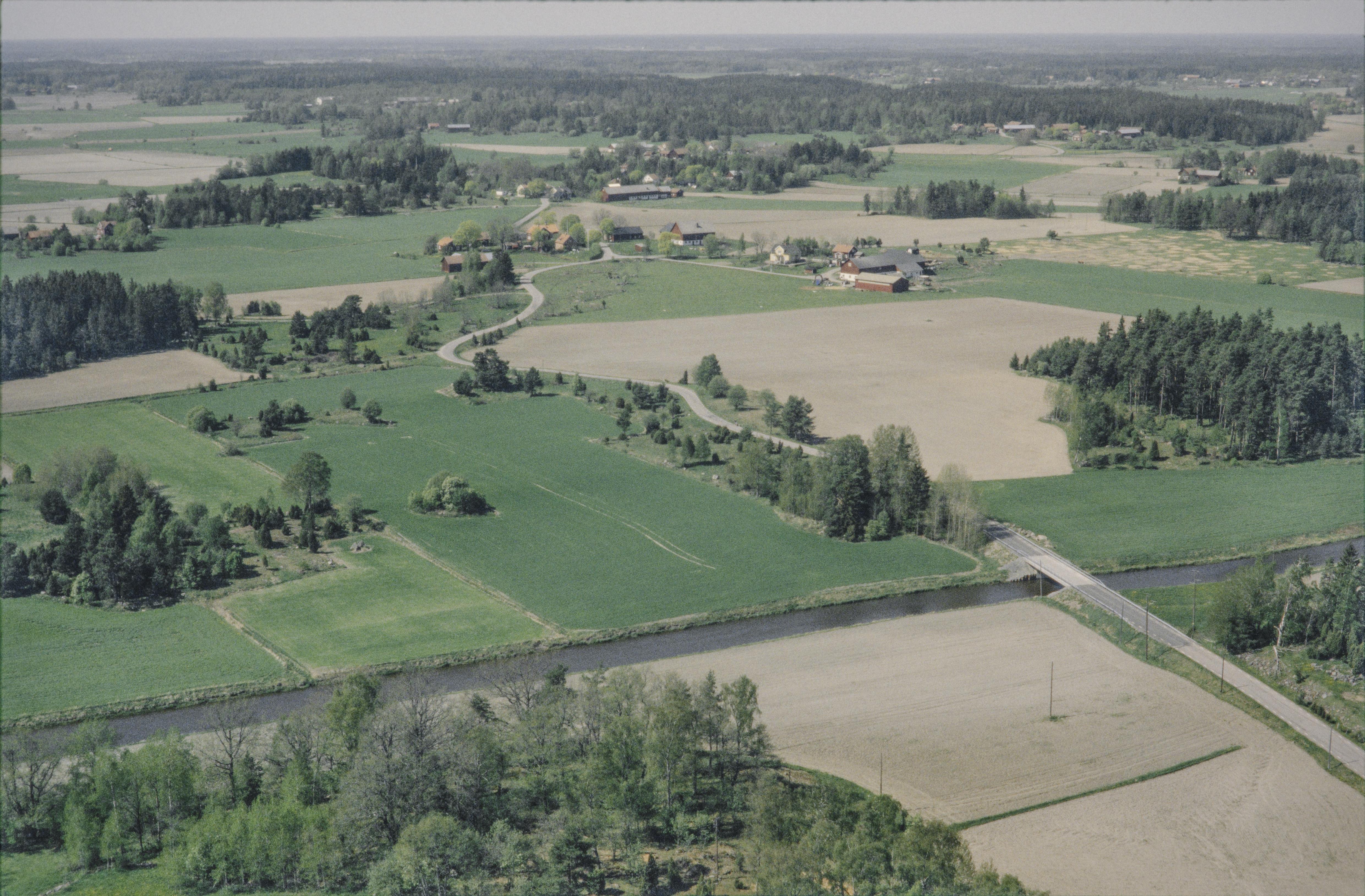 Beskrivning: Över bildens mitt Rista by i Olandsåns dalgång. Till vänster om bildens mitt området Klangkroken med hög RAÄnr Ekeby 8:1 och gravfält Ekeby 9:1. Bilden är tagen mot (väderstreck): NV