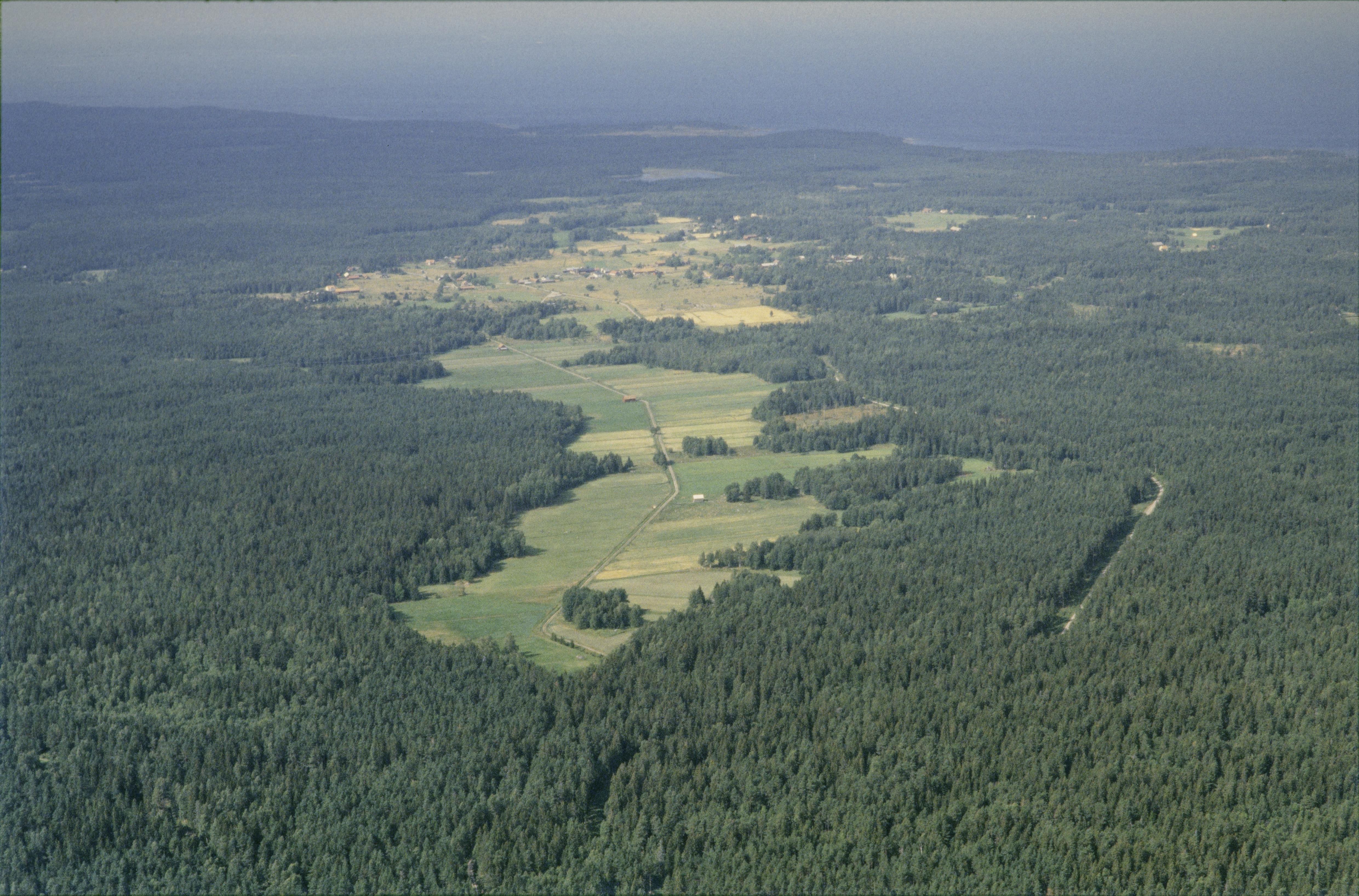 Beskrivning: Österrönningens dalgång. Över bildens mitt Hållens by i bytomt RAÄnr Hållnäs 280. Till höger i bildens övre del Björns skärgårds naturreservat. Bilden är tagen mot (väderstreck): NV