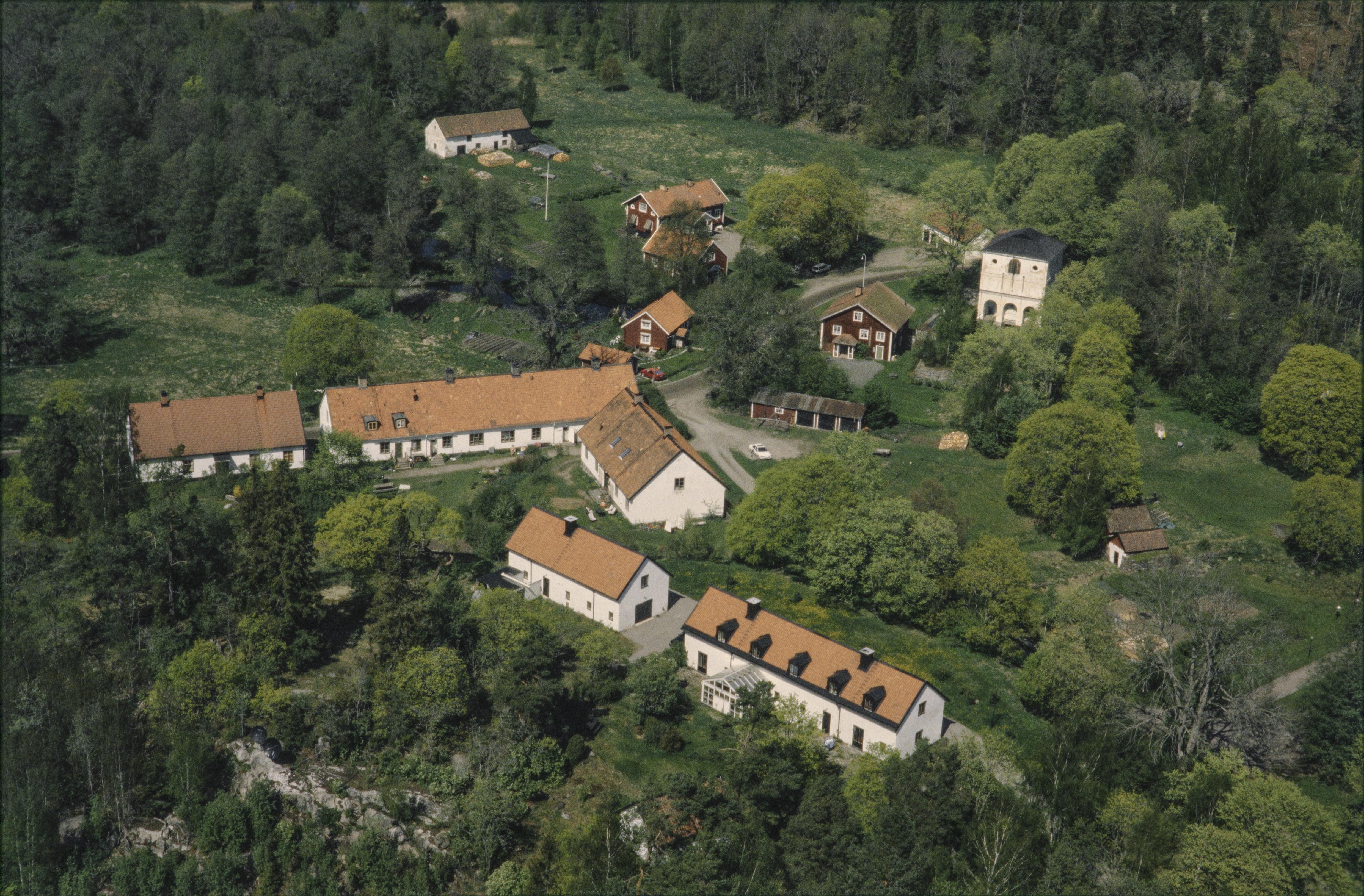 Beskrivning: Vällnora bruk vid Upplandsleden mellan sjöarna Vällnoren och Svartviken. Vid bildens mitt hytt- och hammarområden RAÄnr Knutby 111:1. Bilden är tagen mot (väderstreck): N