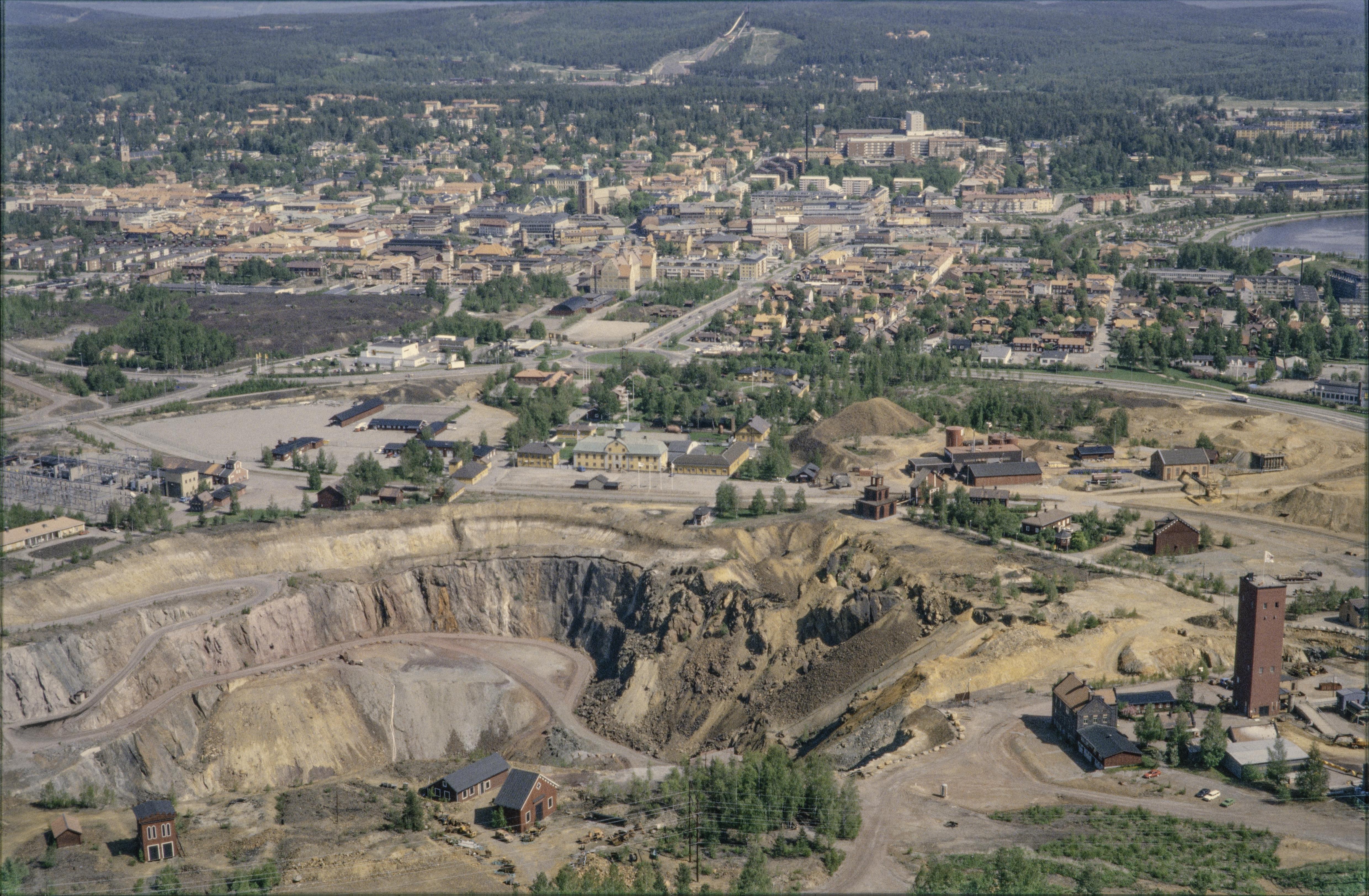 Beskrivning: I bildens nedre del gruvhålet Stora Stöten RAÄnr Falun 17:1 i Falu koppargruva sydväst i Falu stad. Gruvmuseet vid bildens mitt. Falu Kristine kyrka i bildens övre del. Bilden är tagen mot (väderstreck): NO