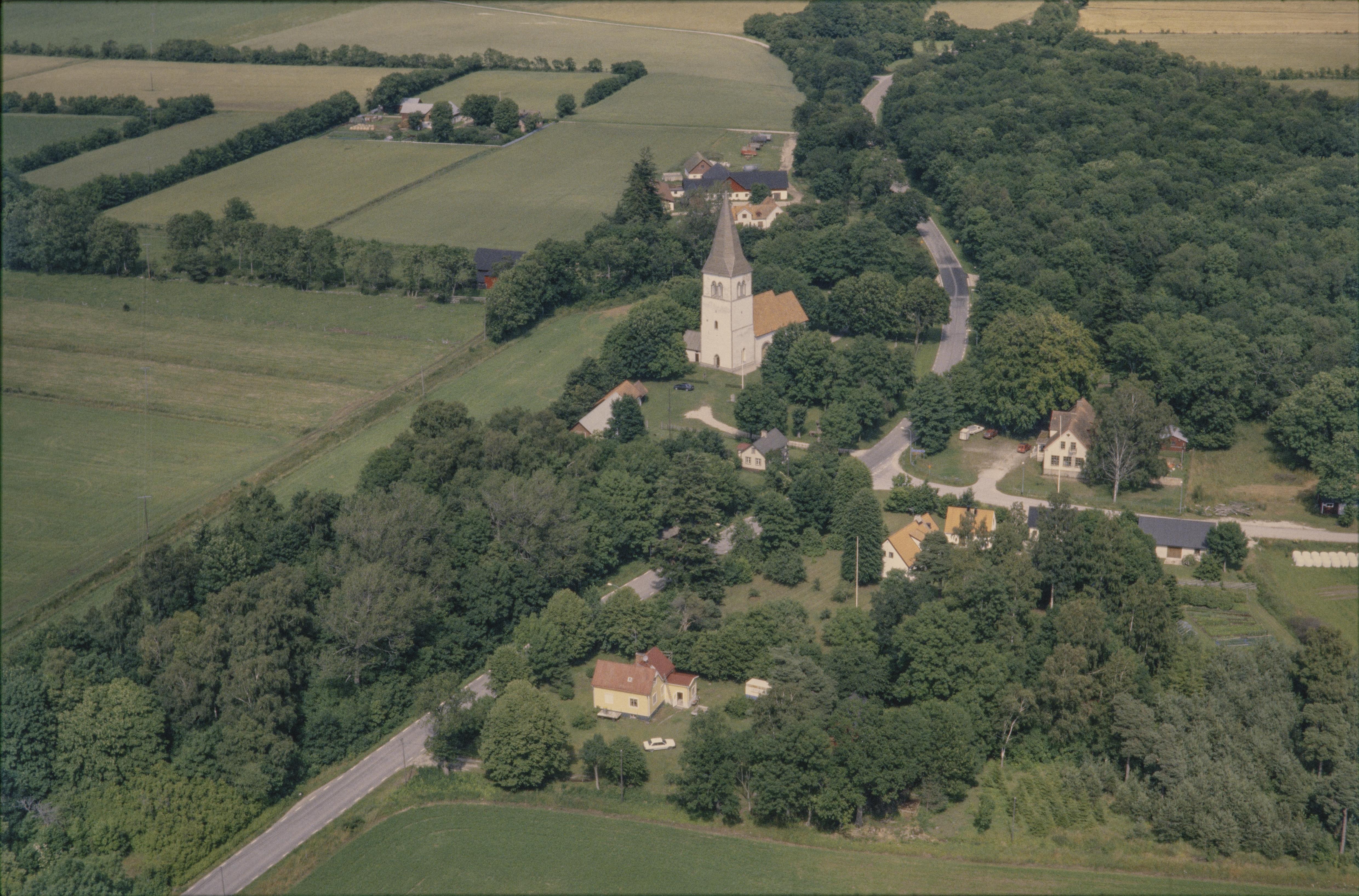 Beskrivning: Eke kyrka och kyrkby. Vid kyrkan vägmärke RAÄnr Eke 43:2. Bilden är tagen mot (väderstreck): NO