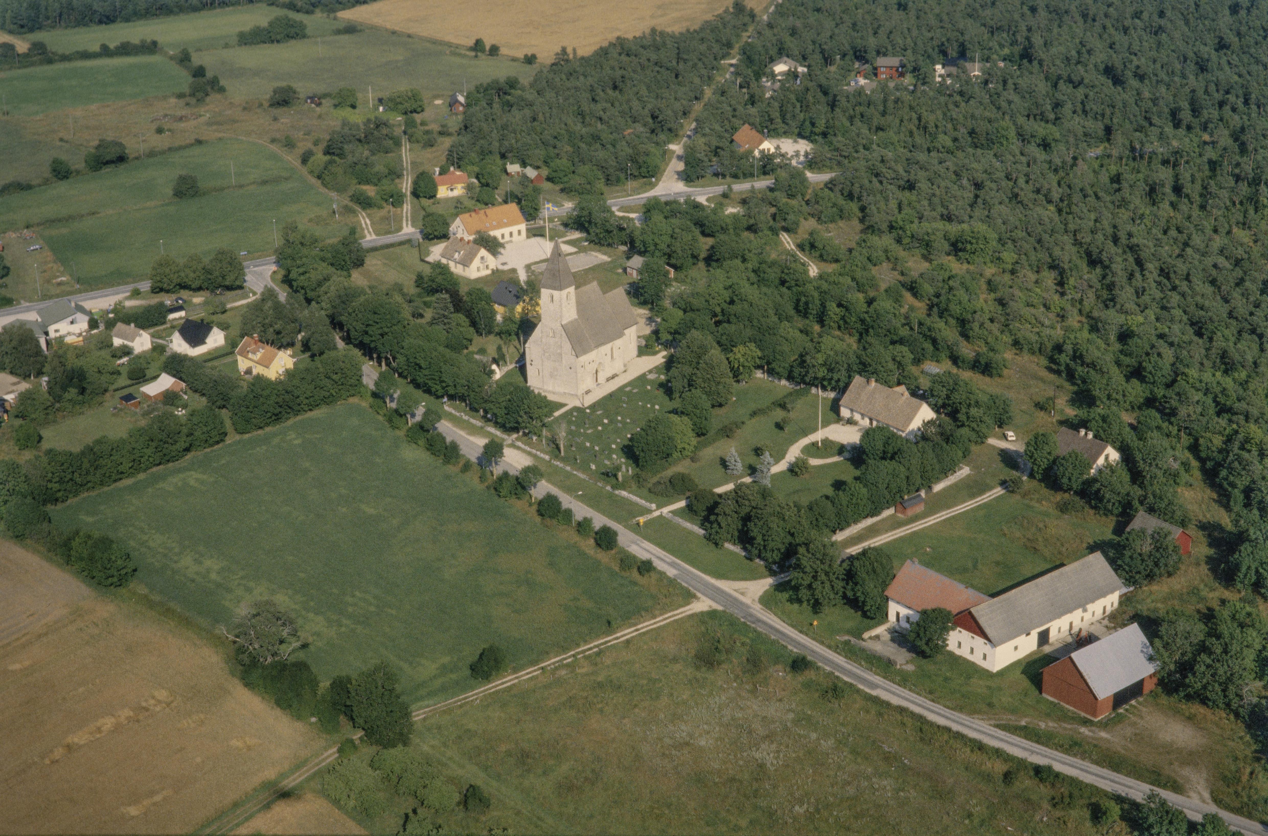 Beskrivning: Endre kyrkby. Endre skola och Endre kyrka över bildens mitt. Till höger om kyrkan en sten med tradition RAÄnr Endre 61:1. Bilden är tagen mot (väderstreck): ONO