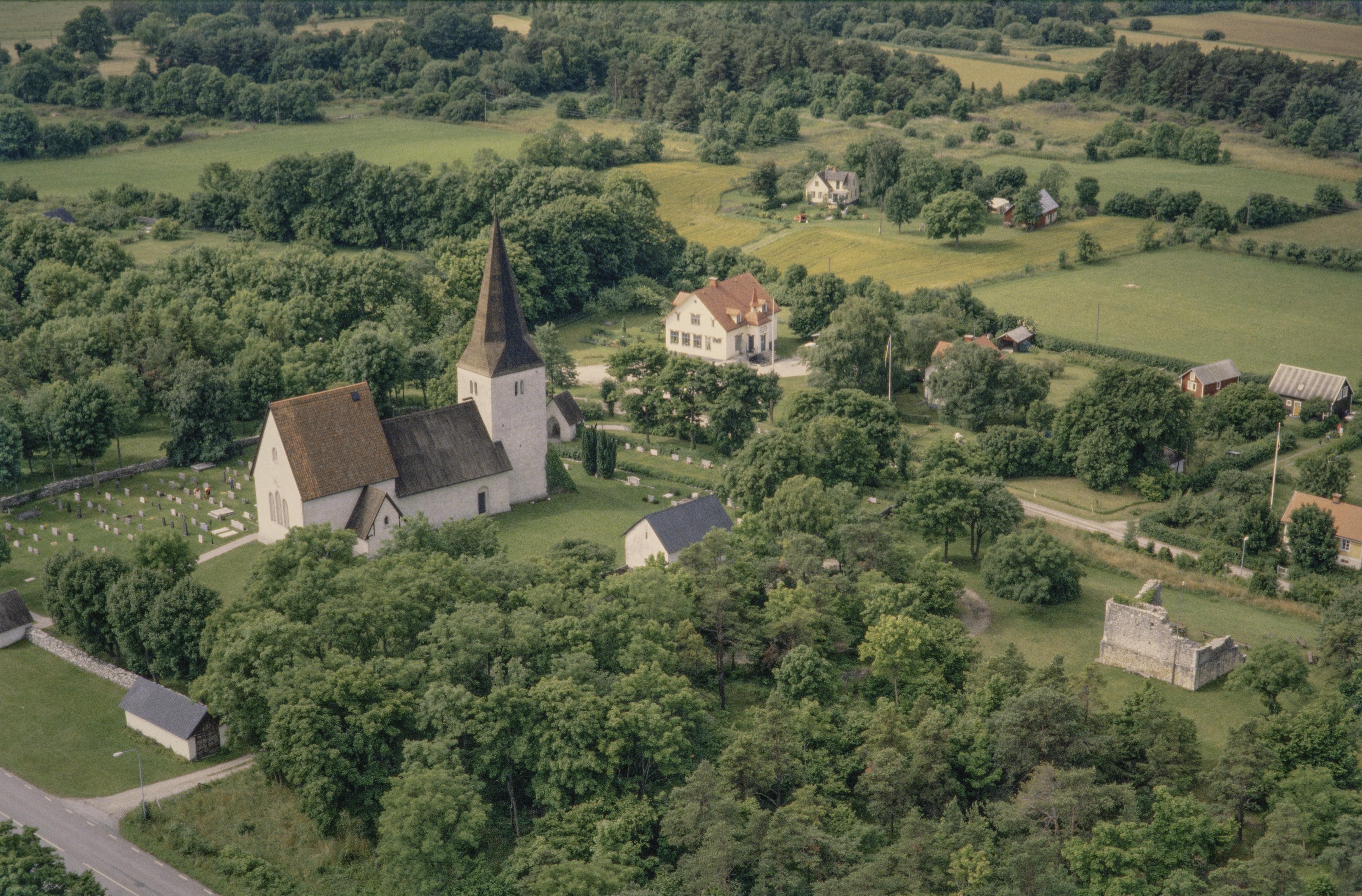 Beskrivning: Fröjels kyrka och kyrkby. Vid kyrkan kastal (ruin) RAÄnr Fröjel 11:1. Bilden är tagen mot (väderstreck): SSV