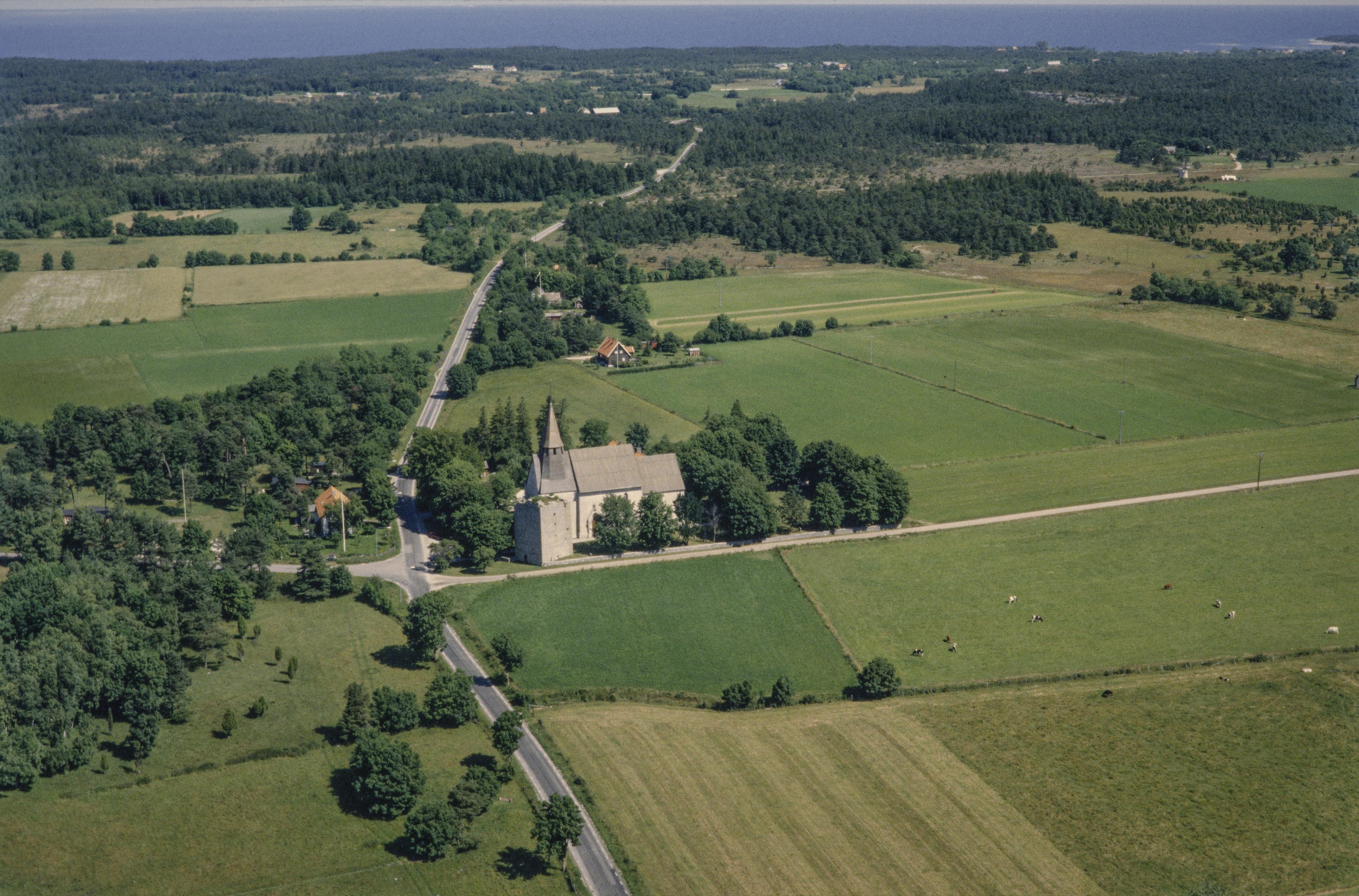 Beskrivning: Gammelgarns kyrka i bildens mitt. Vid kyrkan ett kastal RAÄnr Gammelgarn 103:1. Bilden är tagen mot (väderstreck): N