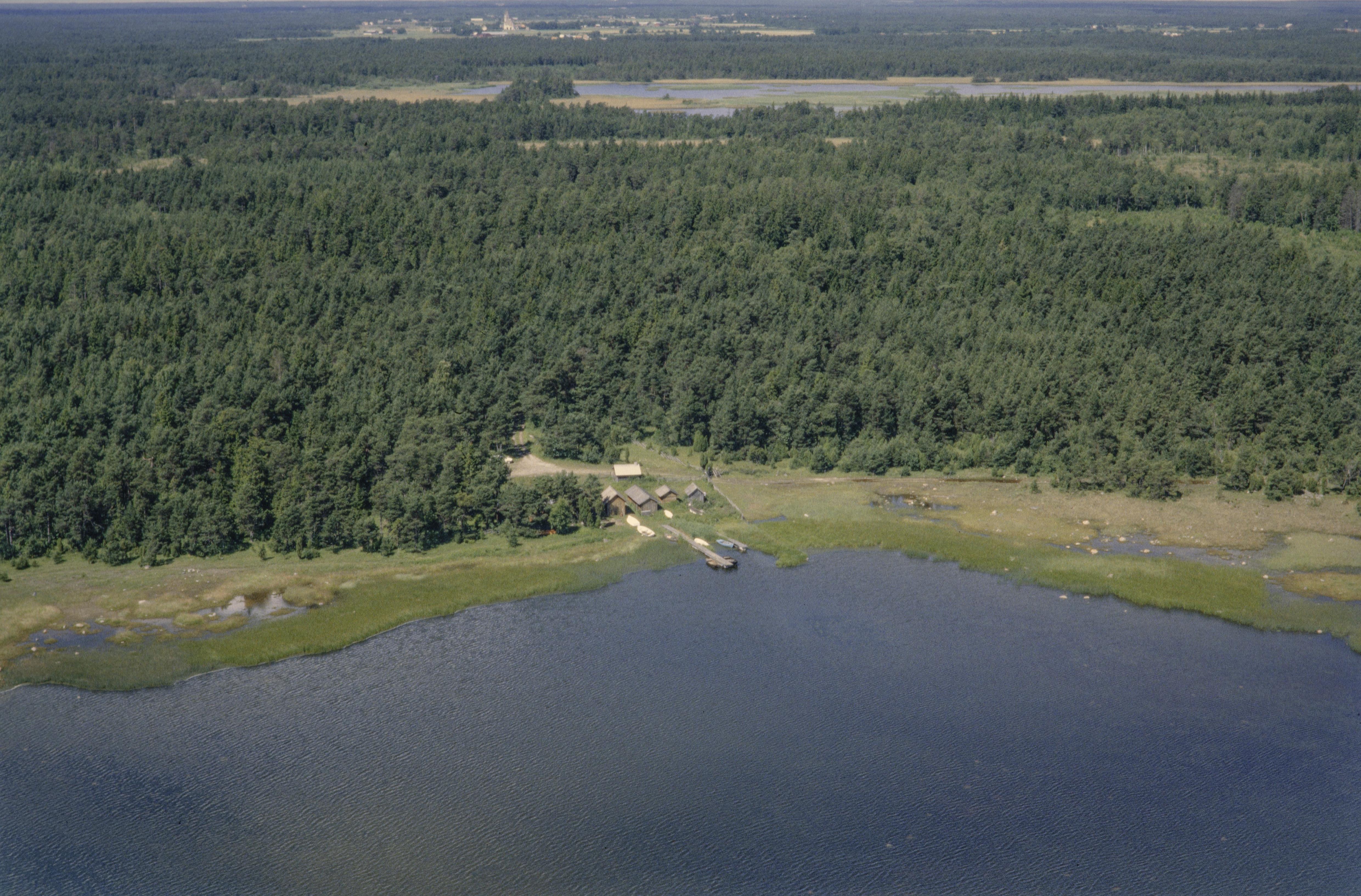 Beskrivning: Fiskeläget Agbod. I skogen till höger om fiskeläget hägnad RAÄnr Gothem 279. I bildens övre del sjön Storsund i Storsunds naturreservat. Bilden är tagen mot (väderstreck): NV