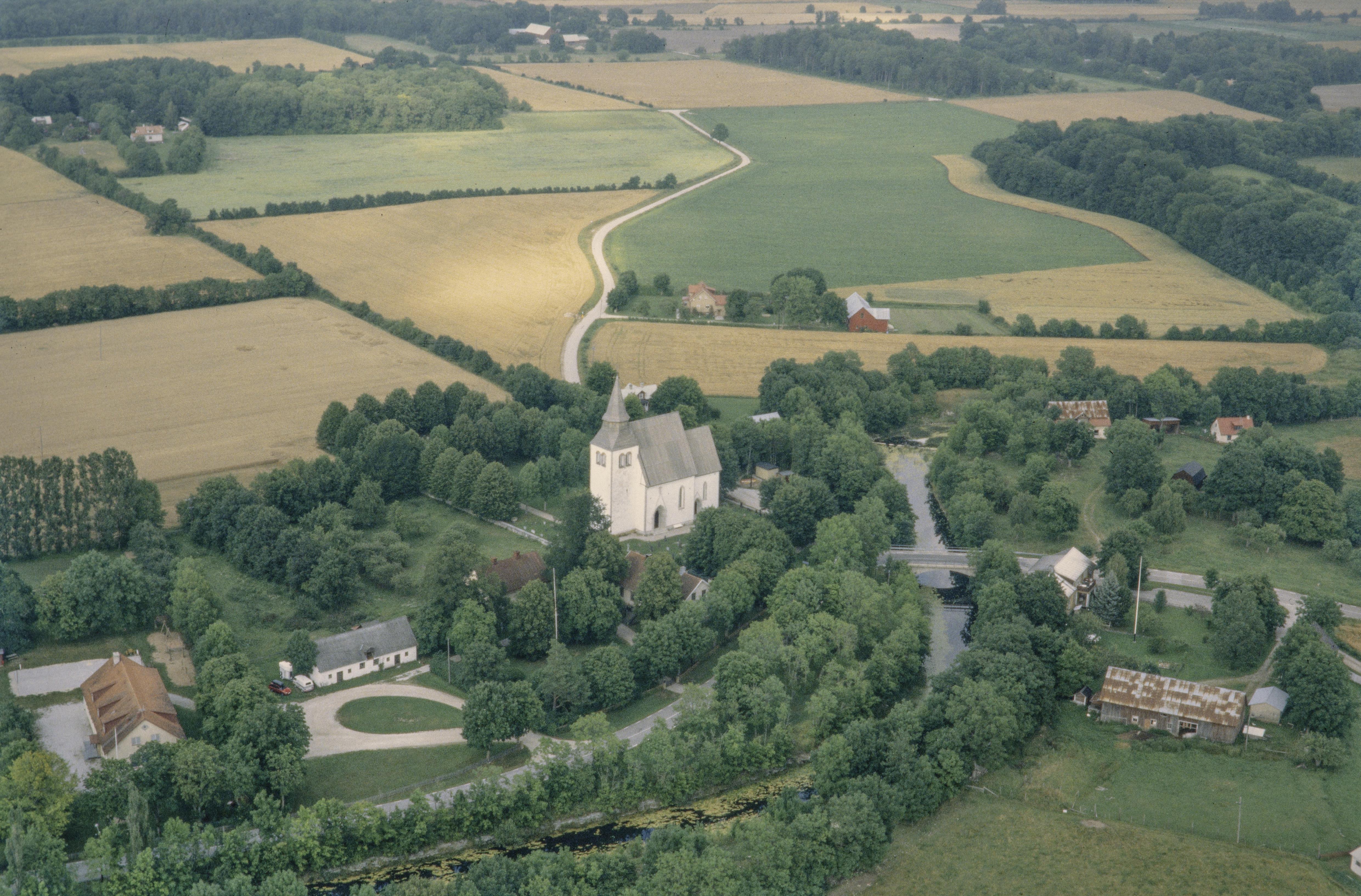 Beskrivning: Hörsne kyrkby vid Hörsneån. Hörsne kyrka i bildens mitt. Hörsne skola nere till vänster. Till höger om kyrkan Möllegårds gamla tomt RAÄnr Hörsne 169:1. Bilden är tagen mot (väderstreck): NO
