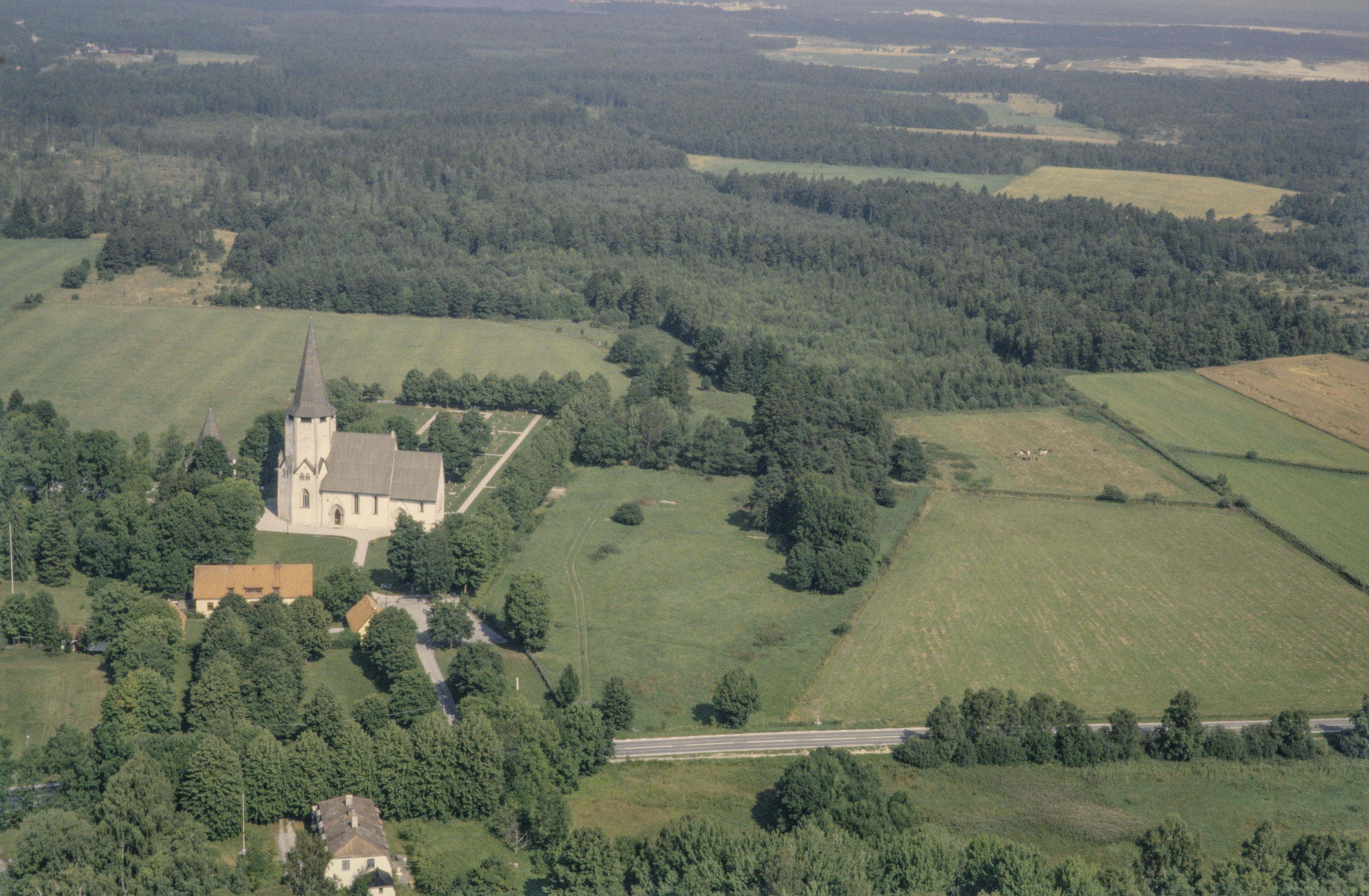 Beskrivning: Lärbro kyrkby. Lärbro kyrka till vänster om bildens mitt. Vid kyrkan stensättning RAÄnr Lärbro 179:1. Bilden är tagen mot (väderstreck): NNV
