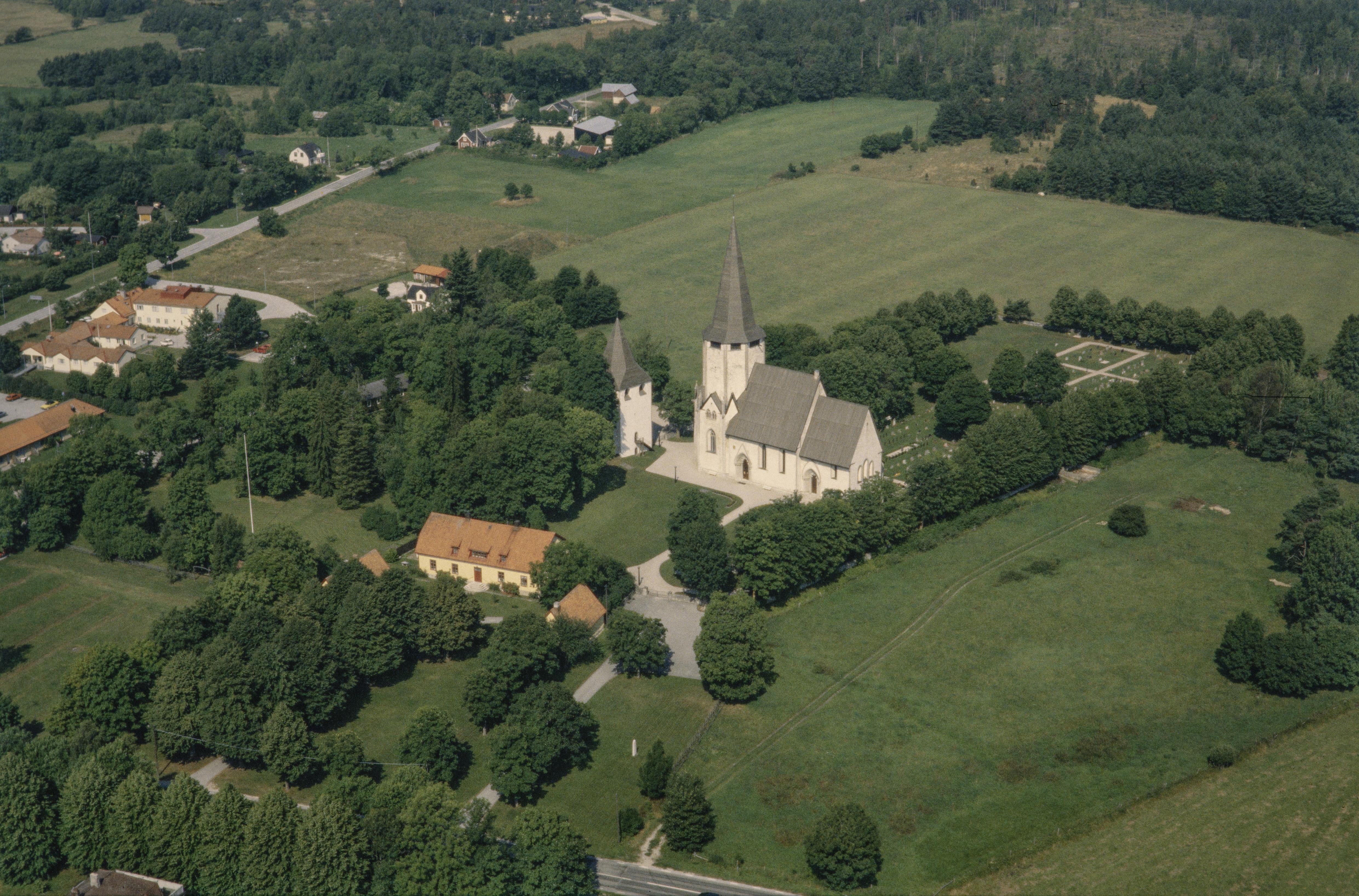 Beskrivning: Lärbro kyrkby. Lärbro kyrka i bildens mitt. Vid kyrkan stensättning RAÄnr Lärbro 179:1. Bilden är tagen mot (väderstreck): NV