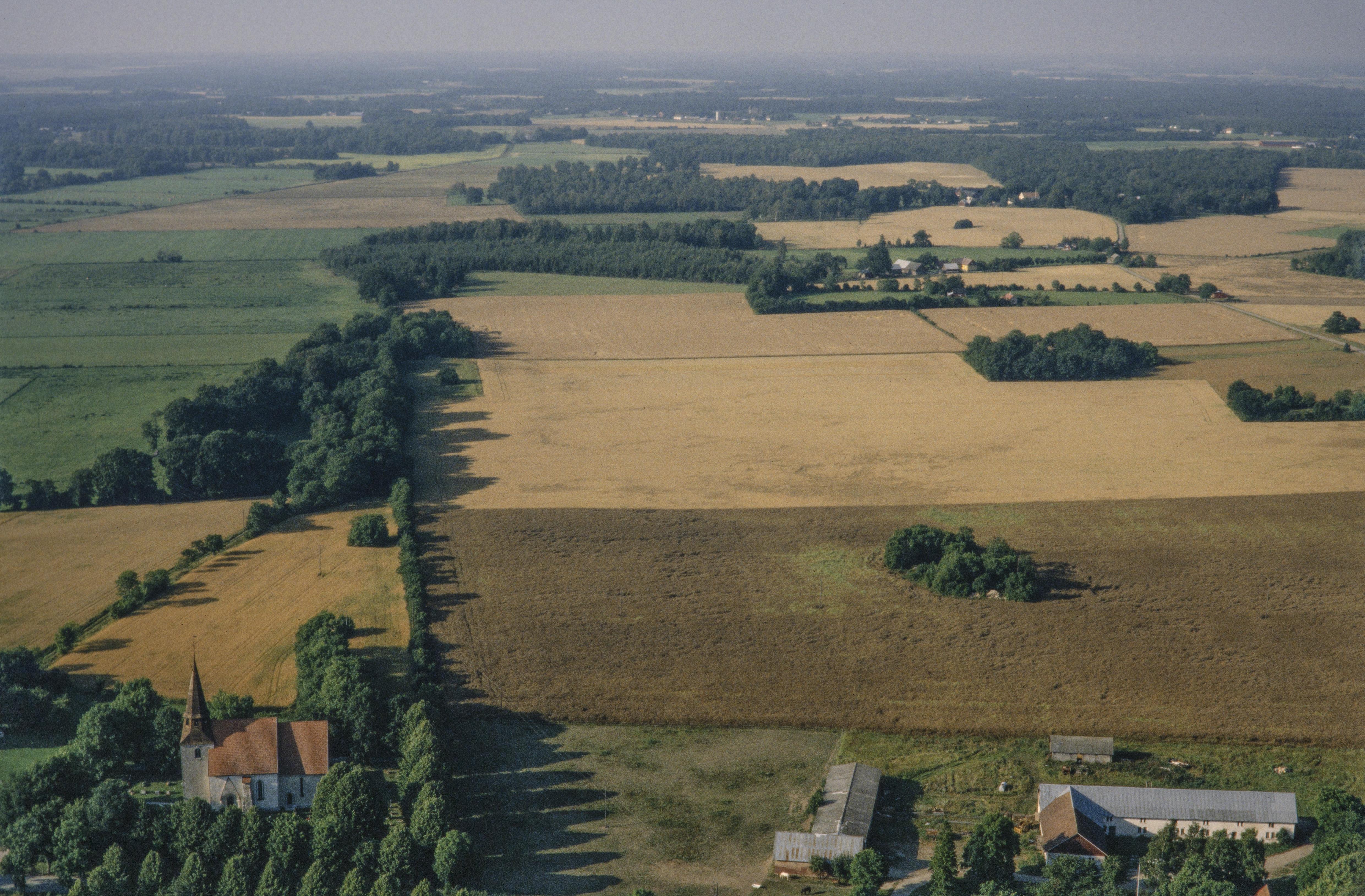 Beskrivning: Vänge kyrka nere i bildens vänstra hörn. Till vänster över bildens mitt stensättning RAÄnr Vänge 78:1 och hägnad Vänge 35:1 vid området Brogardsmyr. Socknet Sjonhem i bildens övre del. Bilden är tagen mot (väderstreck): N