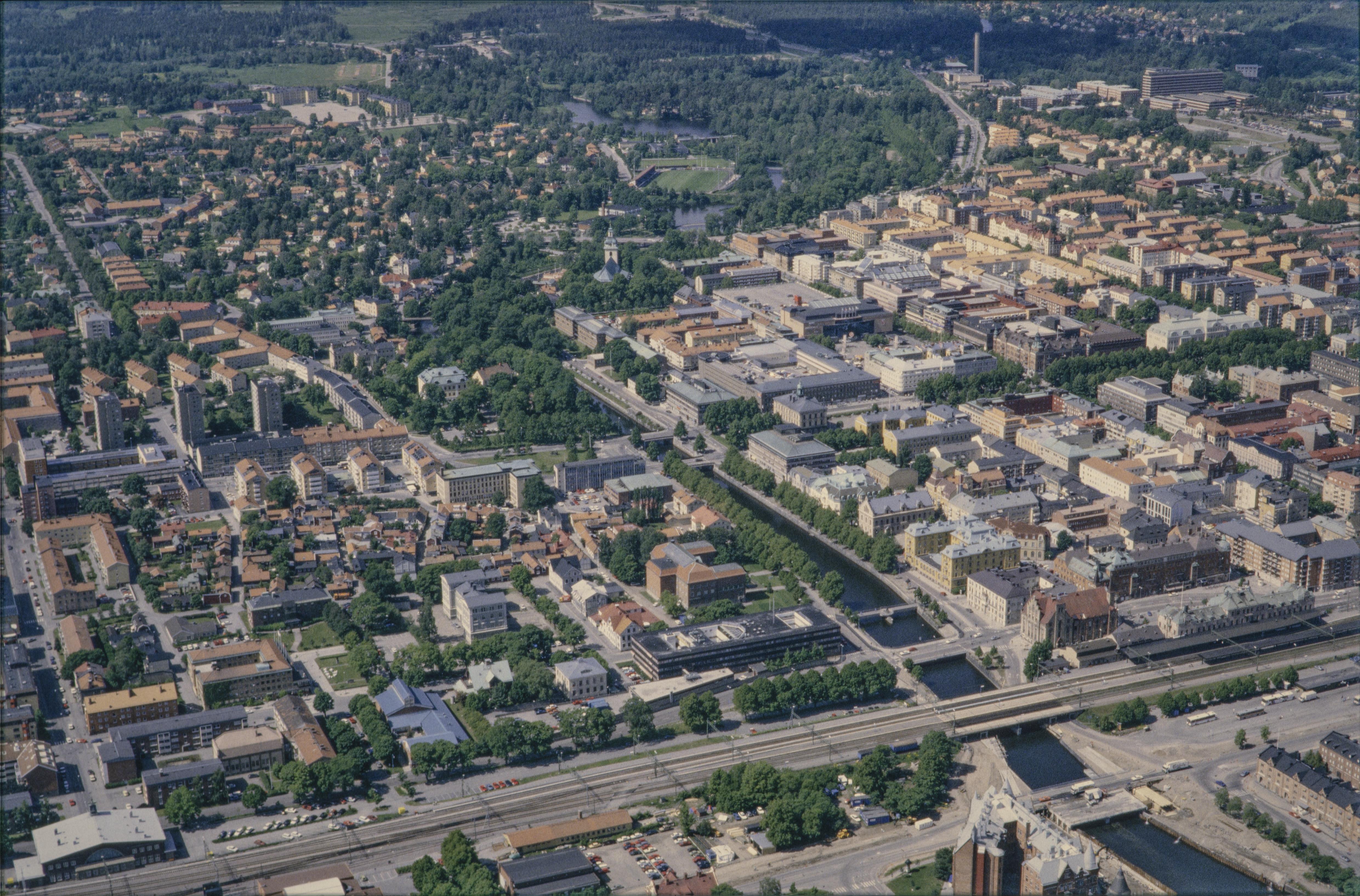 Beskrivning: Gävle tätort och Gavleån. Stadslager RAÄnr Gävle 51:1. Över bildens mitt Heliga Trefaldighetskyrkan. Bilden är tagen mot (väderstreck): V