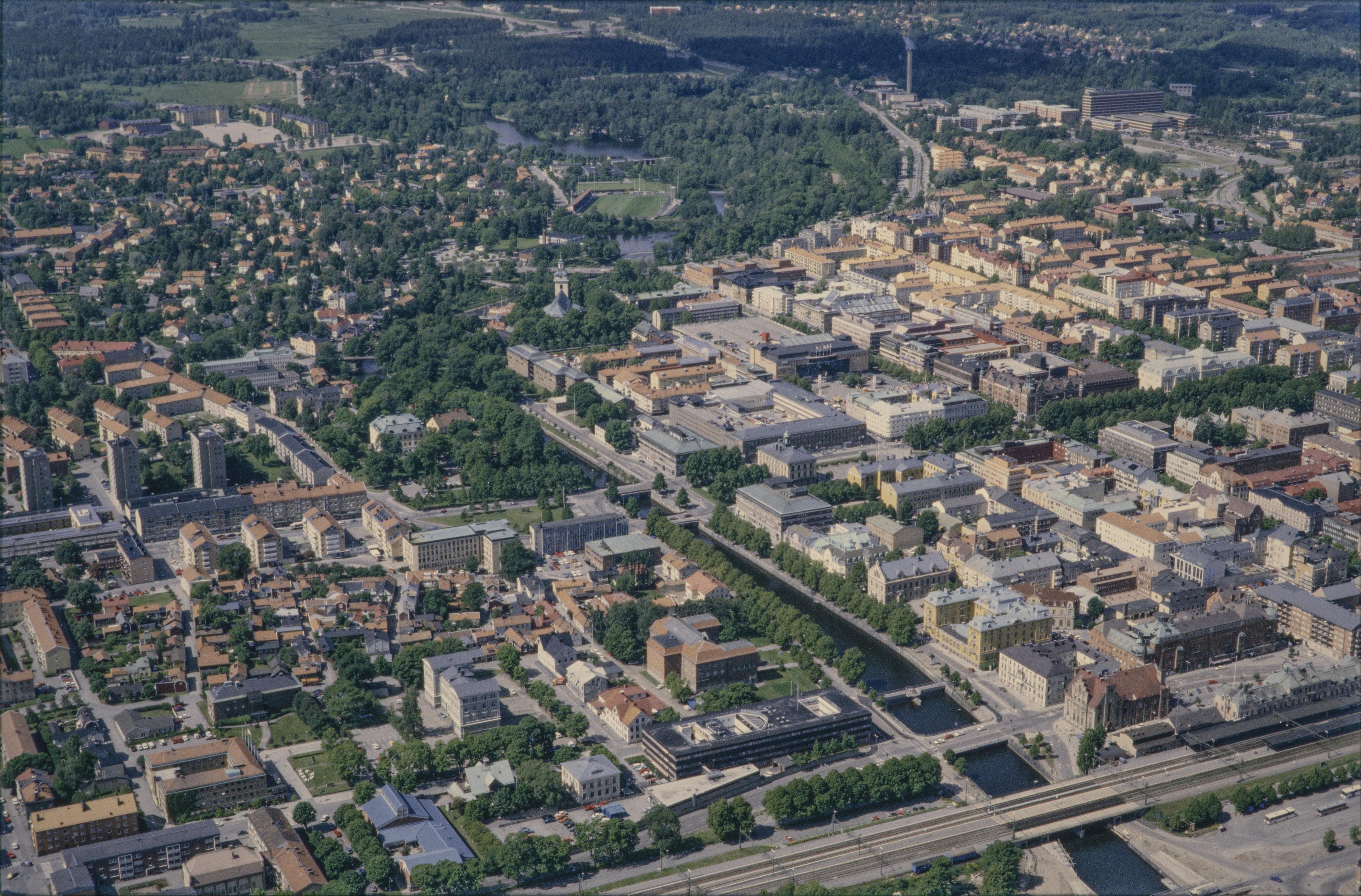 Beskrivning: Gävle tätort och Gavleån. Stadslager RAÄnr Gävle 51:1. Över bildens mitt Heliga Trefaldighetskyrkan. Bilden är tagen mot (väderstreck): V