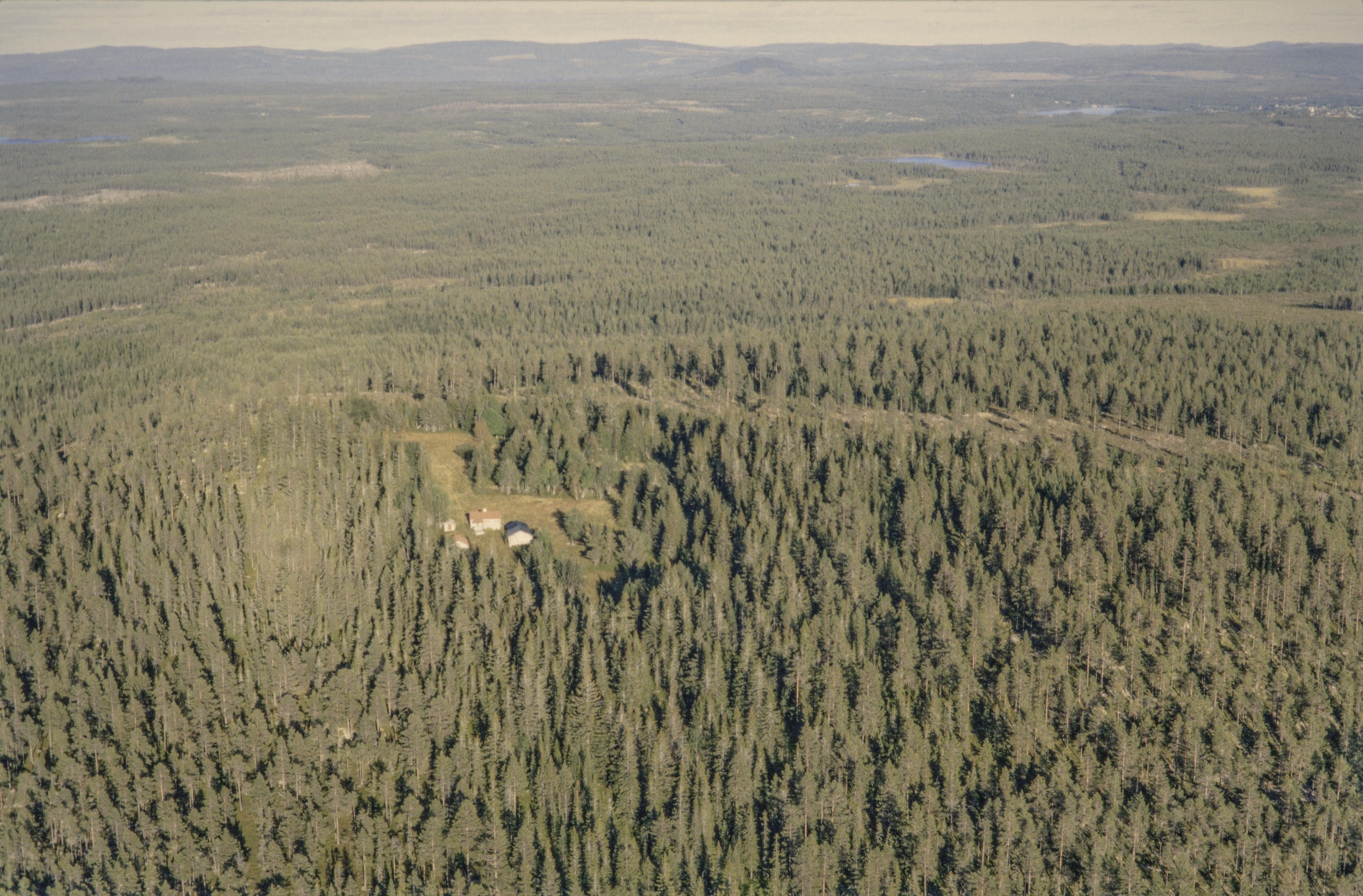 Beskrivning: Fäboden Bergsvallen. I skogen i bildens övre del blästblats RAÄnr Lillhärdal 129:1. Uppe till höger skymtas Kyrkbyn i Lillhärdal. Bilden är tagen mot (väderstreck): Ö