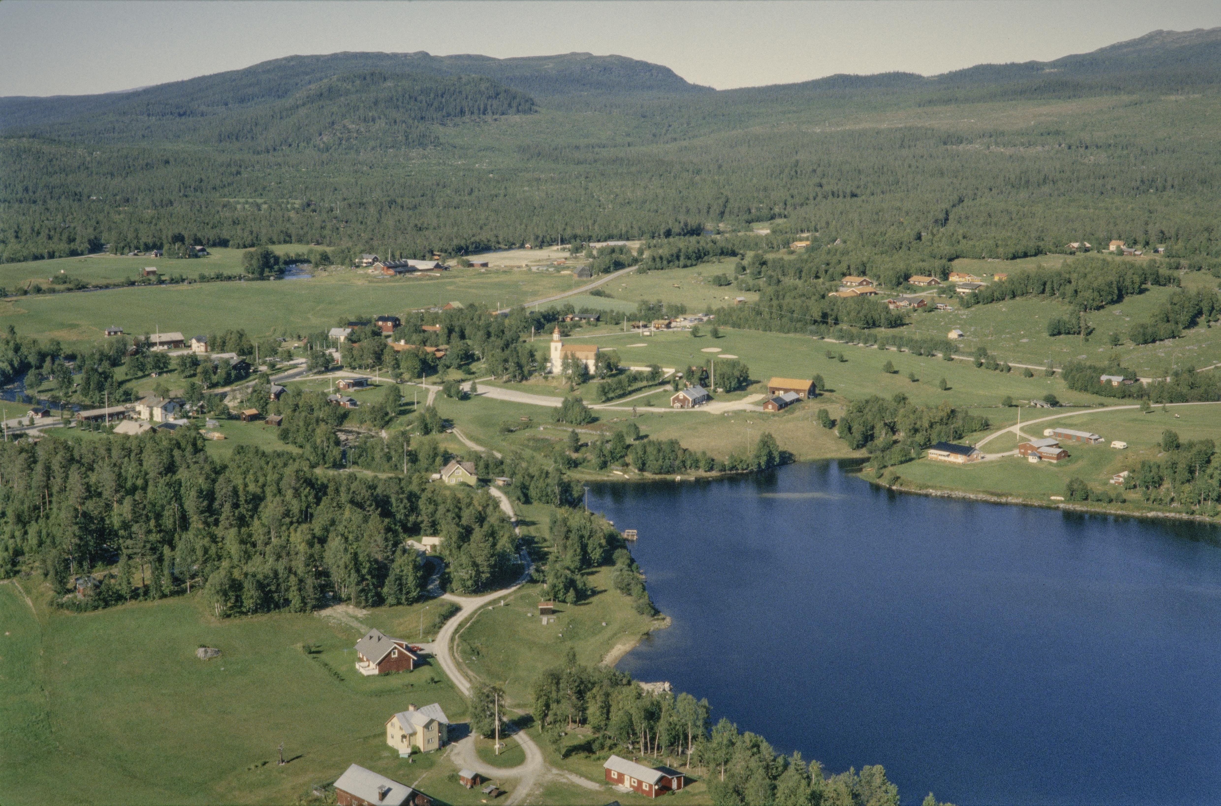 Beskrivning: Ljusnedals kyrkby vid älven Ljusnans mynning vid Ljusnedalssjön. Vid mitt hyttområde RAÄnr Tännäs 254:1 och Ljusnedals kyrka. Bilden är tagen mot (väderstreck): N