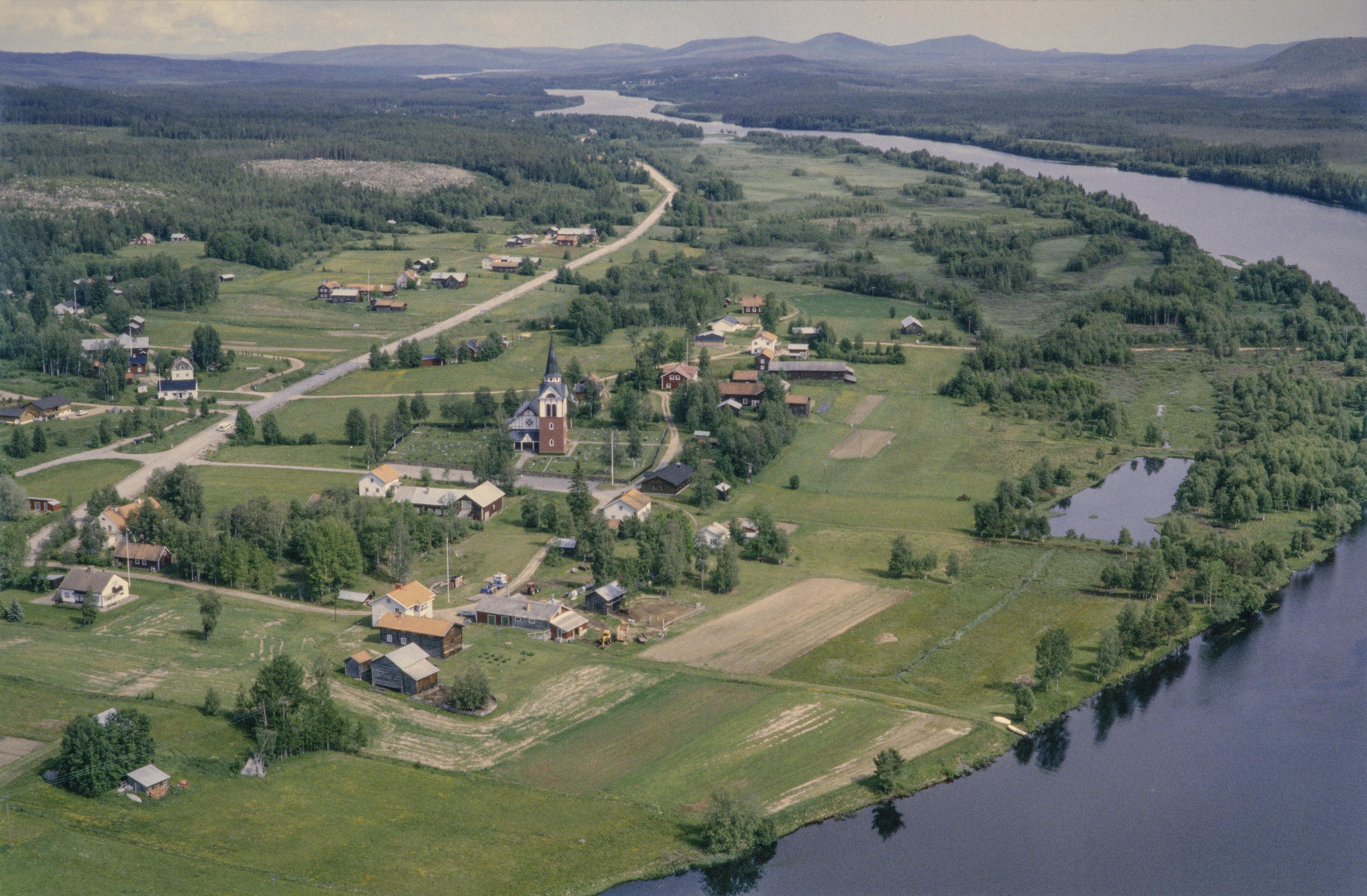 Beskrivning: Älven Ljusnan vid Älvros kyrkby. Älvros nya kyrka (Älvros kyrka) i bildens mitt. I byn bytomt RAÄnr Älvros 464, 483, 465, 474, 484, 545 m.fl. Bilden är tagen mot (väderstreck): Ö
