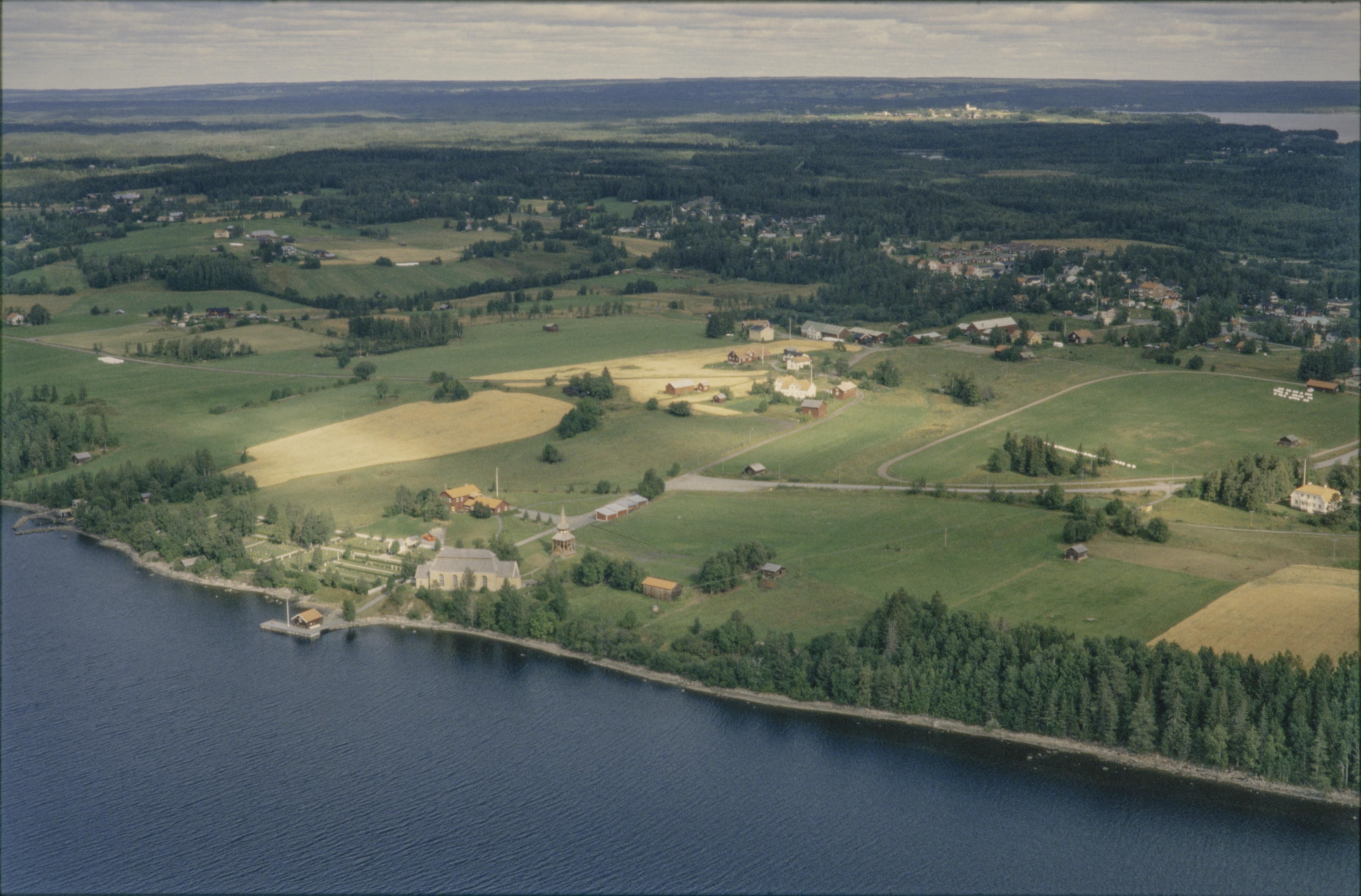 Beskrivning: Storsjön, östra sidan. Hackås kyrkby. Hackås kyrka och kastalruin RAÄnr Hackås 92:1 vid stranden till vänster under bildens mitt. Bilden är tagen mot (väderstreck): NO