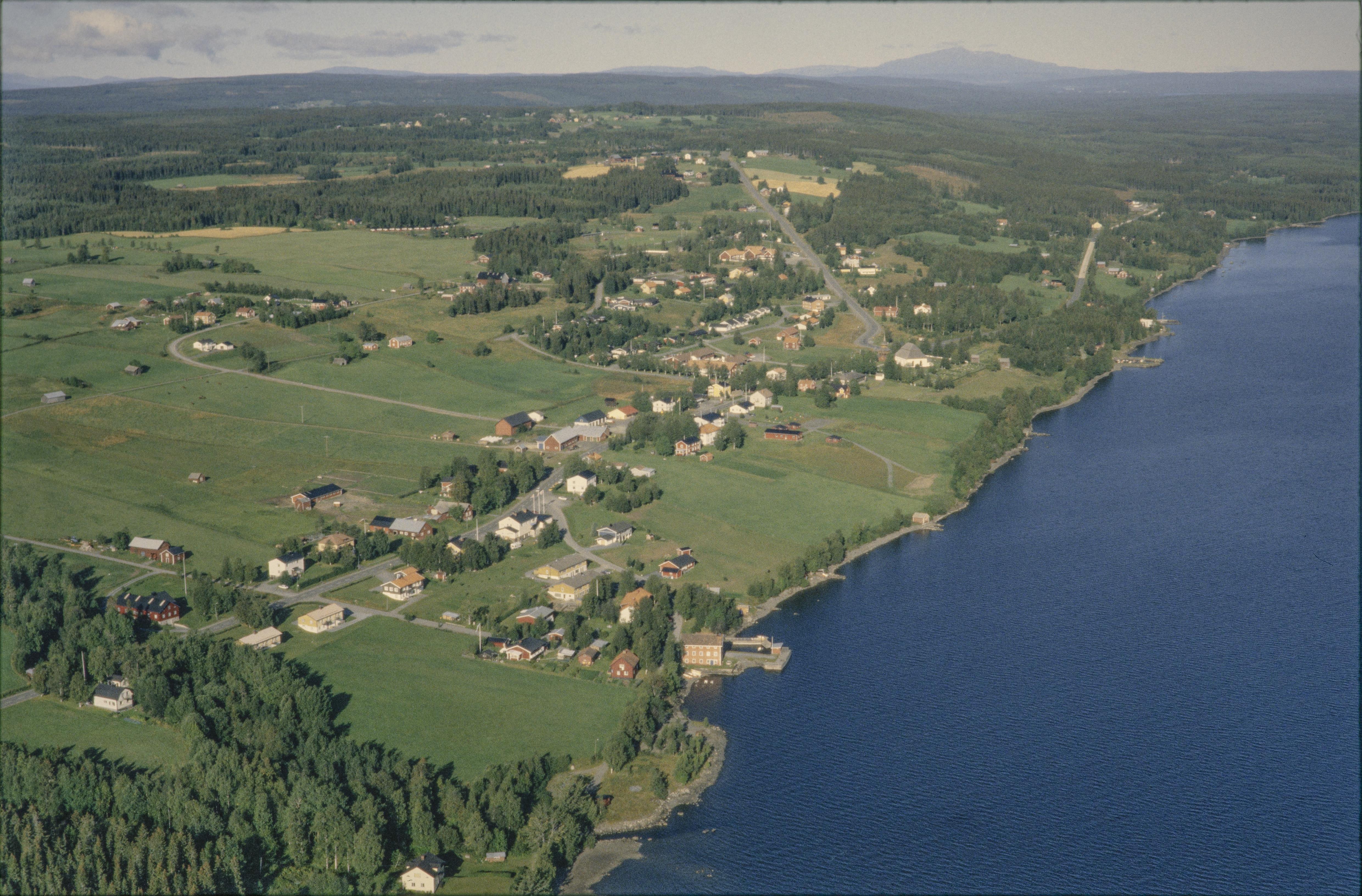 Beskrivning: Storsjön, västra delen vid Indalsälven. Hallens kyrkby med bytomt RAÄnr Hallen 144:1. Hallens kyrka till höger om bildens mitt. I bildens nedre del Sågbäcken utlopp i sjön. Bilden är tagen mot (väderstreck): VNV
